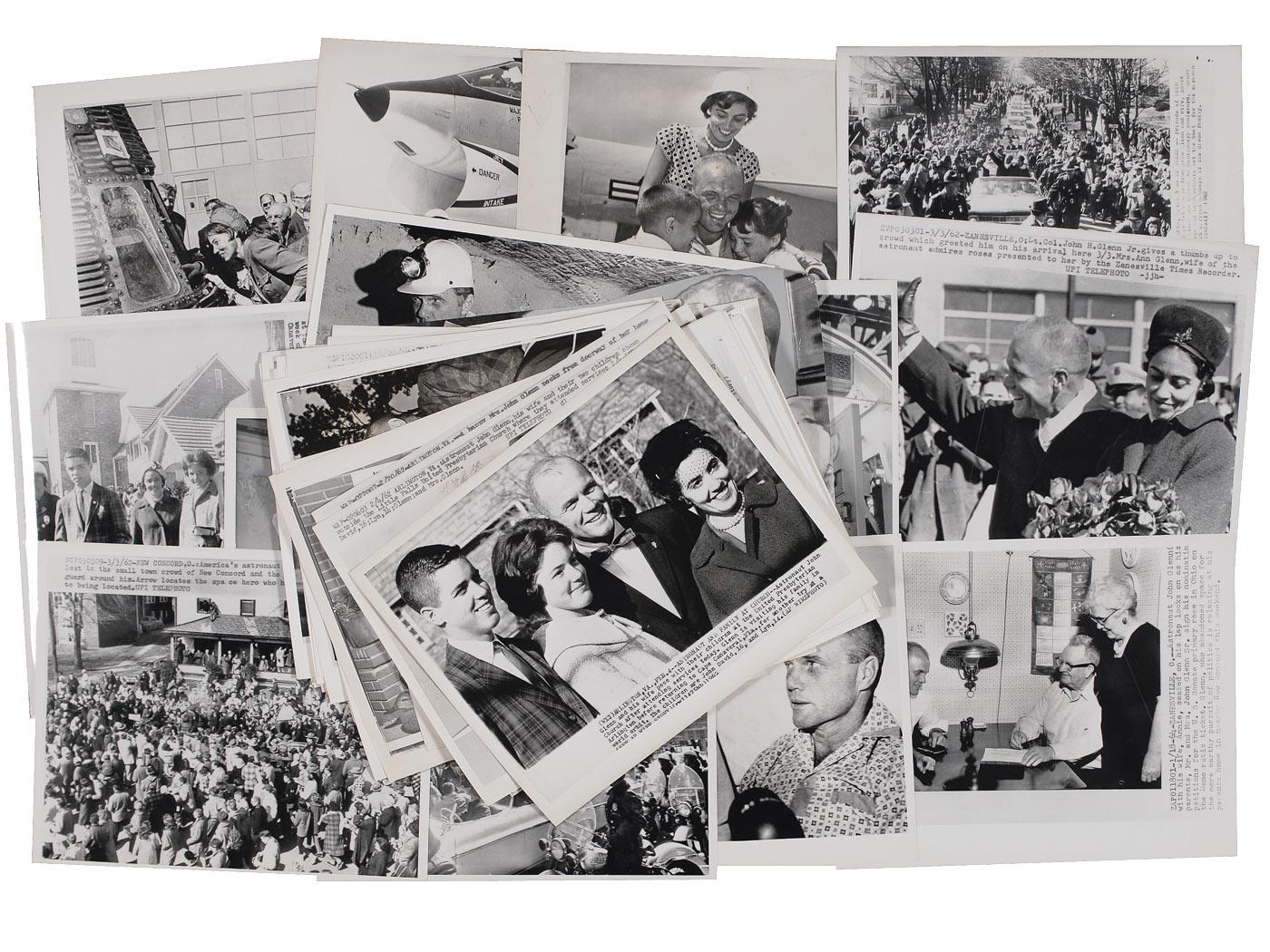 A collection of 57 unsigned glossy photos. almost all either 8 x 10 or 10 x 8 press photos, all featuring John Glenn. Photos are mostly from after his historic Mercury mission, and include photos of awards ceremonies, parades, family shots, a few after he declared candidacy for Senator, and Glenn visiting various locations, both foreign and domestic, including Washington, D.C., Tokyo, New York, and skiing with Robert Kennedy. In very good overall condition.