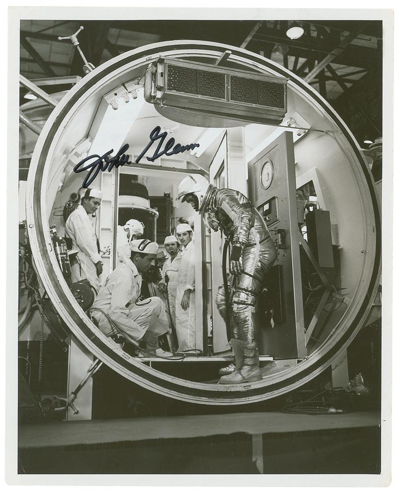 Glossy 8 x 10 NASA photo of Glenn during his training for his Mercury mission, signed in black felt tip. In fine condition, with some scattered light creases, mostly to edges and corners, and a bit of scattered light silvering.