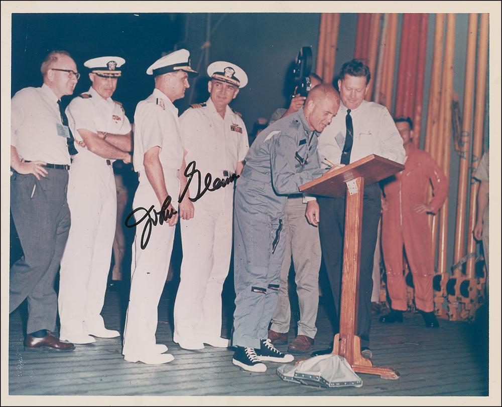 Color glossy 10 x 8 photo of John Glenn at a podium following his Mercury flight, signed in black felt tip. In fine condition, with a couple of tiny corner bends and areas of scuffing to the emulsion.