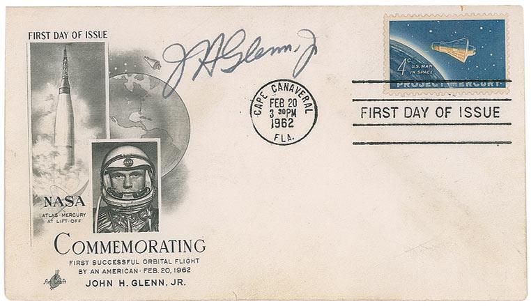 FDC with a cachet honoring Project Mercury, signed in ink by John Glenn, “J. H. Glenn, Jr.” A few spots of soiling and light toning from envelope glue touching portions of his name, otherwise fine condition.