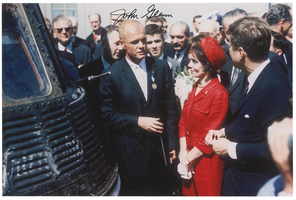 Color glossy 15 x 10 photo of Glenn and his wife inspecting his Mercury capsule with President Kennedy, signed in-person in black felt tip by Glenn. In fine condition.
