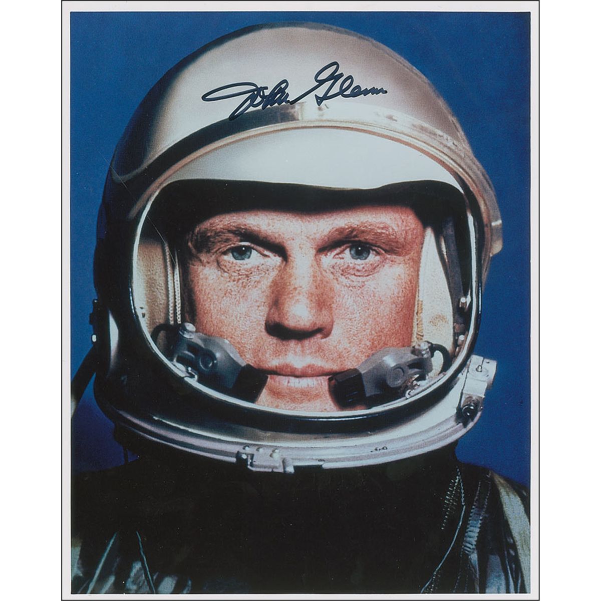 Color glossy 8 x 10 close-up photo of Glenn in his Mercury spacesuit, signed in black felt tip. In fine condition.