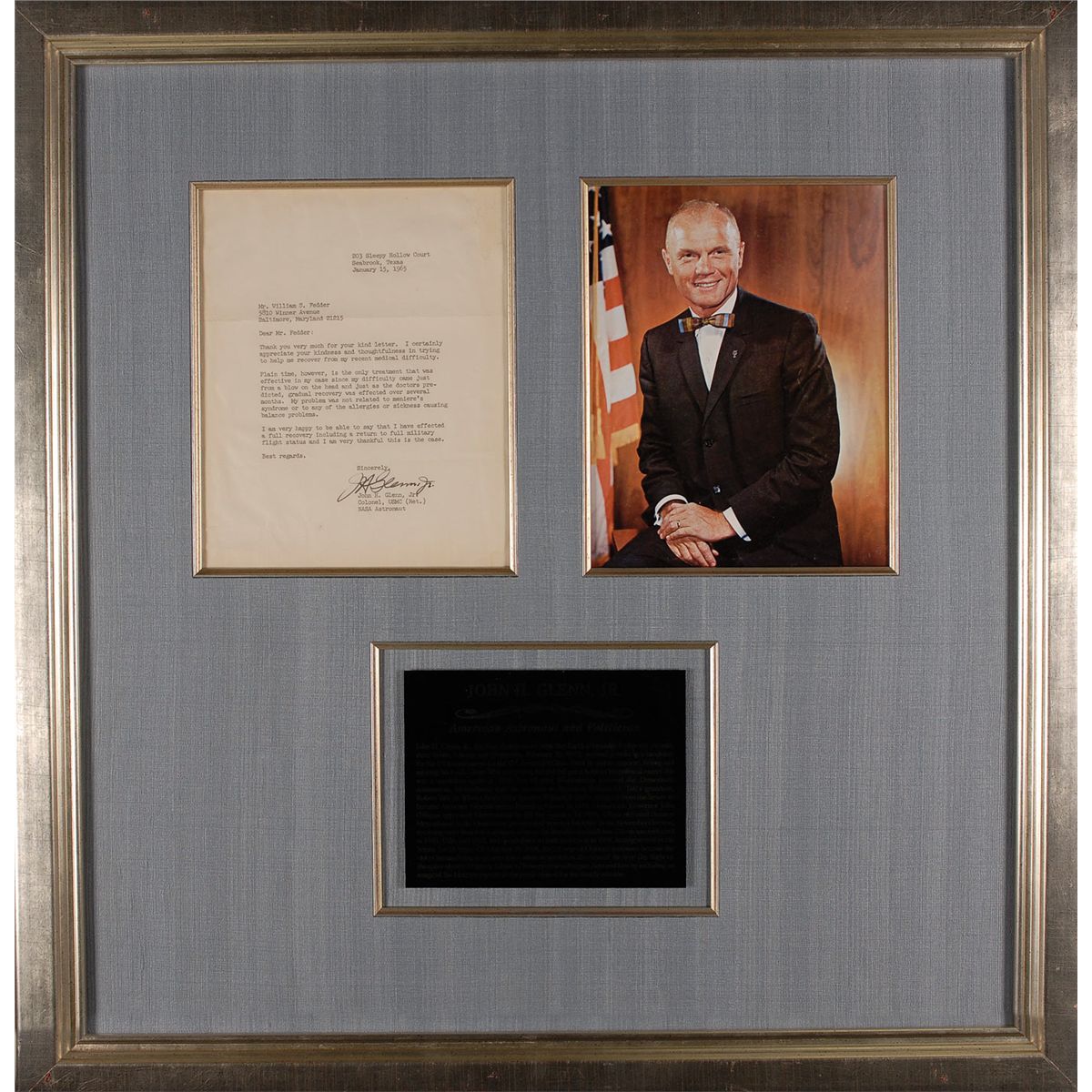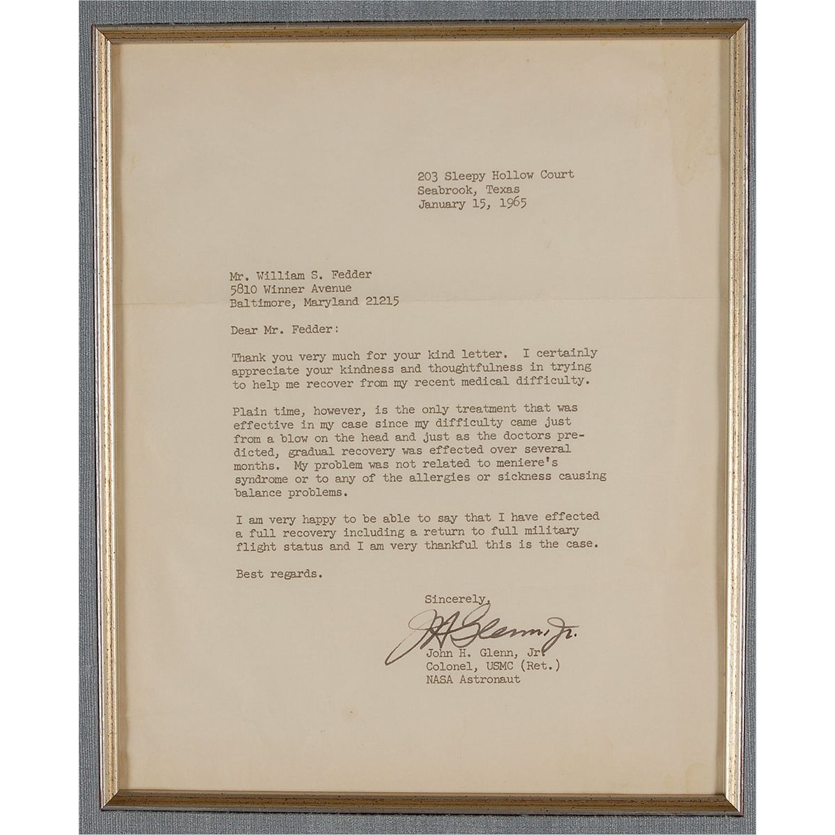 TLS signed “J. H. Glenn, Jr,” one page, 7.5 x 9.5, January 15, 1965. Letter to an admirer concerning his health and fitness after suffering a head injury. In part, “I certainly appreciate your kindness and thoughtfulness in trying to help me recover from my recent medical difficulty. Plain time, however, is the only treatment that was effective in my case since my difficulty came just from a blow on the head and just as the doctors predicted, gradual recovery was effected over several months. My problem was not related to Meniere’s syndrome or to any of the allergies or sickness causing balance problems.” One week later, Glenn would retire from the service and embark on a business career. Nicely cloth matted and framed with a color portrait of Glenn and a biographical plaque to an overall size of 26.5 x 27.5. Expected horizontal folds, light overall toning and a couple creases, otherwise fine condition. Oversized.
