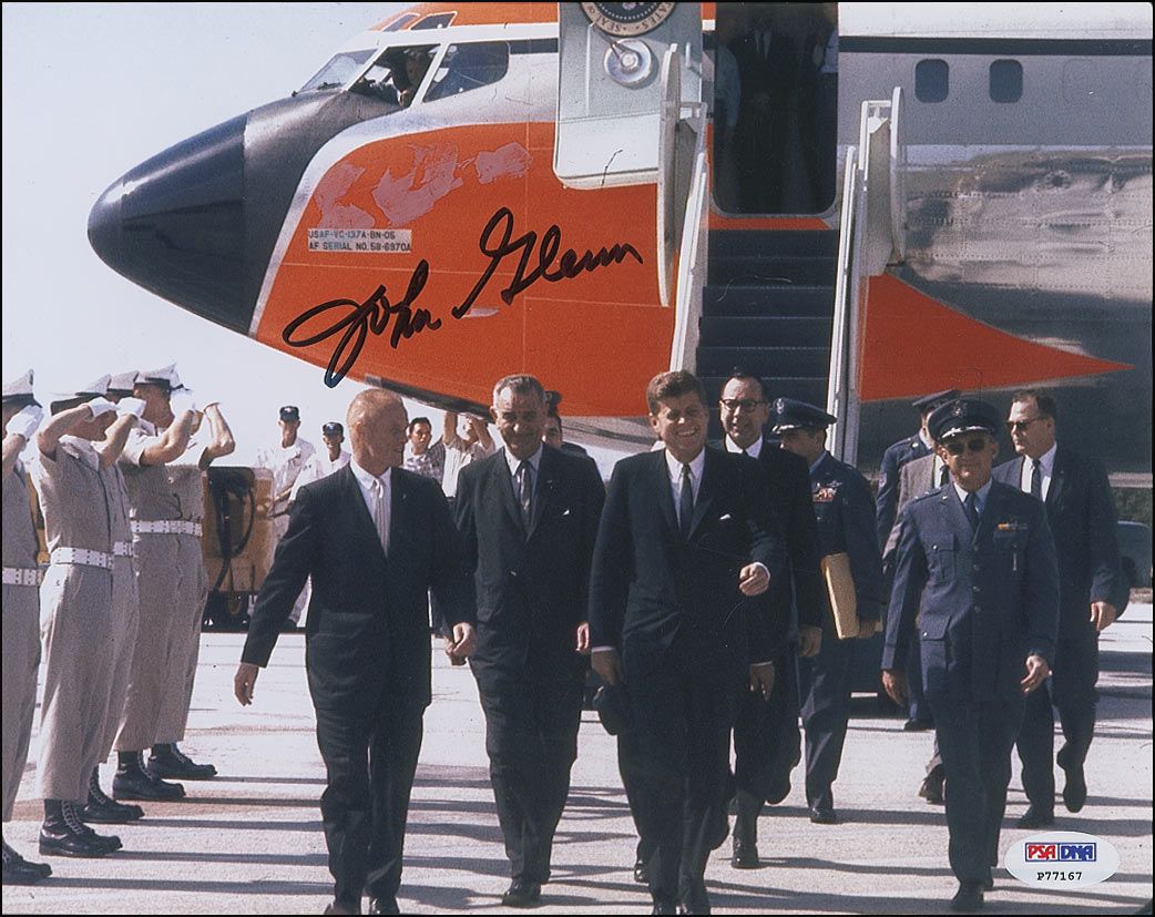 Color glossy 10 x 8 photo of Glenn leaving an airplane with President Kennedy and Vice President Johnson, signed in black felt tip. In fine condition, with a PSA/DNA authentication label affixed to lower corner. Accompanied by a certificate of authenticity from PSA/DNA.