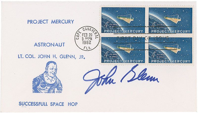 FDC with a cachet honoring Glenn’s Mercury flight, signed in blue felt tip. In fine condition.