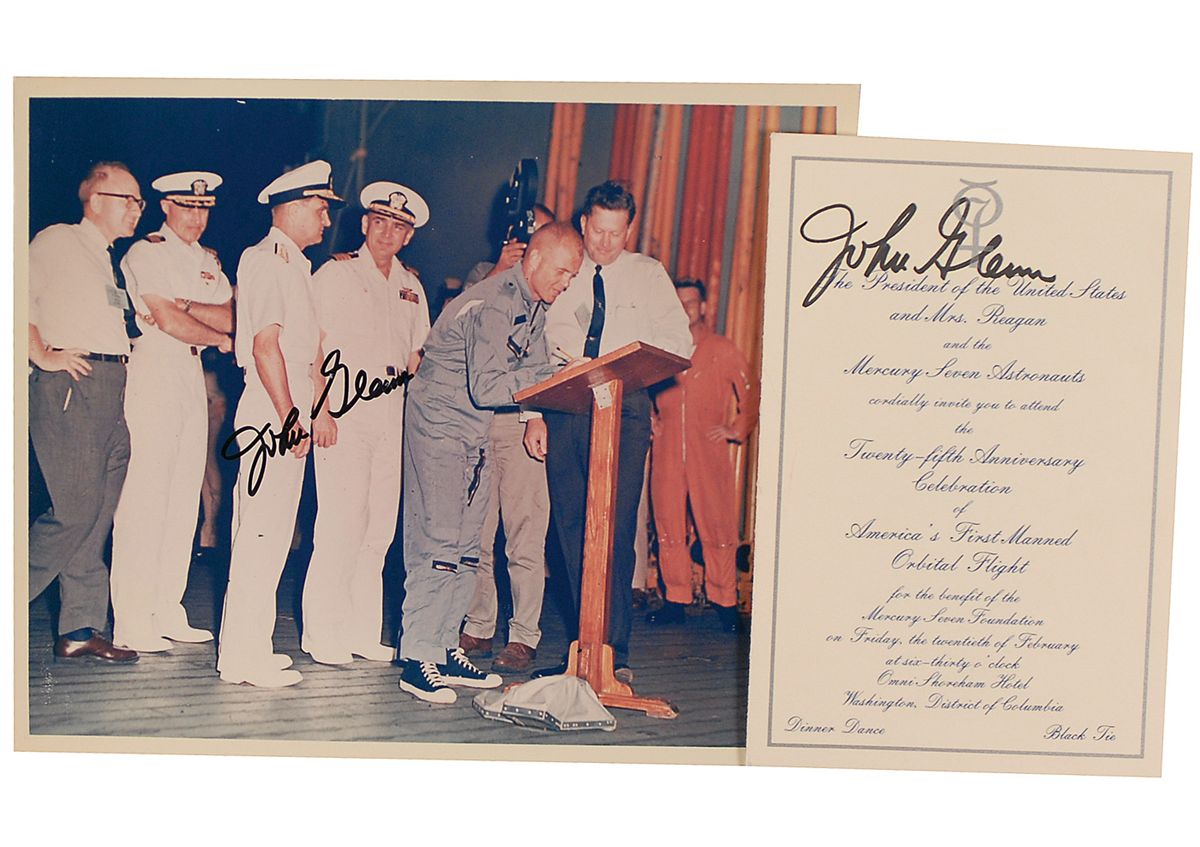 Two items: color glossy 10 x 8 photo of John Glenn at a podium following his Mercury flight, signed in black felt tip; and an original 5 x 7.5 invitation to the 25th anniversary celebration of America’s first manned orbital flight, signed in black felt tip on the front cover “John Glenn” and signed and inscribed in blue ballpoint on the second page “To Ray—Gordon Cooper.” Also signed by astronaut Rick Hauck. In fine condition, with a few light creases and surface marks to photo.