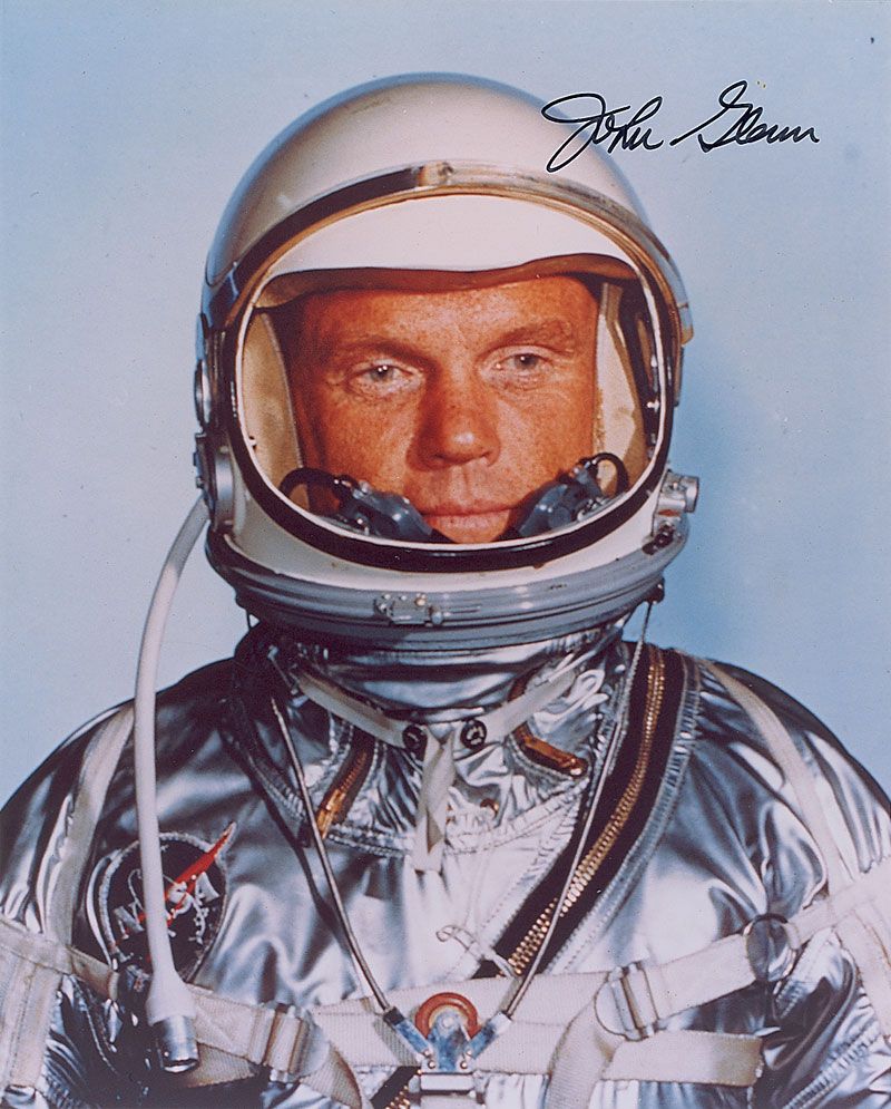 Color satin-finish 8 x 10 photo of Glenn in his Mercury space suit, signed in black felt tip. In very fine condition.