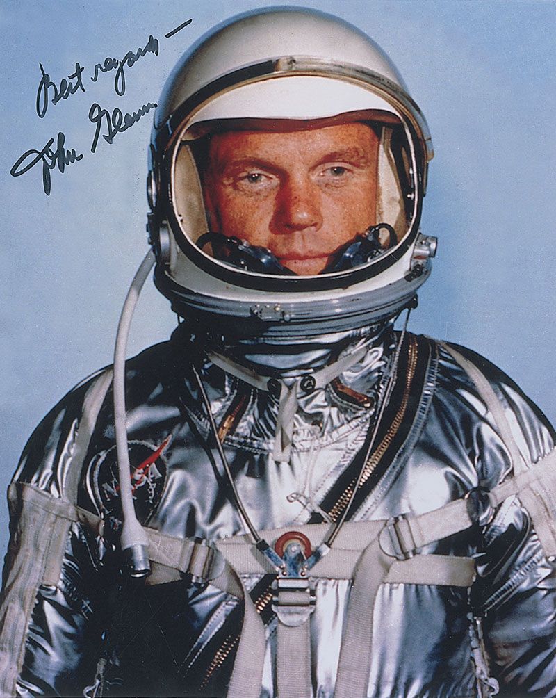Color satin-finish 8 x 10 photo of Glenn in his Mercury space suit, signed in black felt tip. In fine condition.