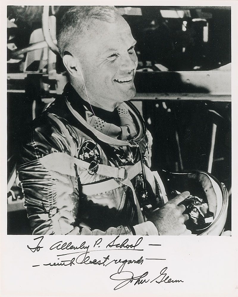 Two photos: one color satin-finish 8 x 10 photo of Glenn in his Mercury helmet, signed and inscribed in blue felt tip, “To Hans—John Glenn”; and one glossy 8 x 10 photo of Glenn, signed and inscribed in the lower border in black felt tip, “To Allenby P. School—with best regards, John Glenn.” In overall fine condition.