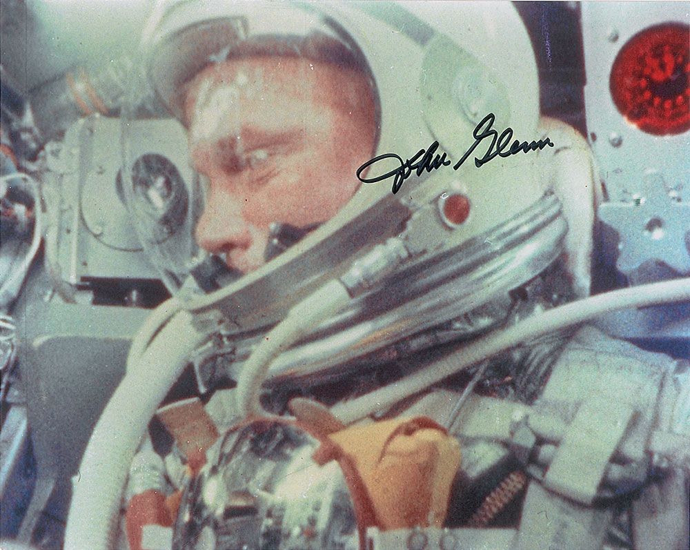 Color satin-finish 10 x 8 photo of Glenn in flight, signed in black felt tip. In fine condition.