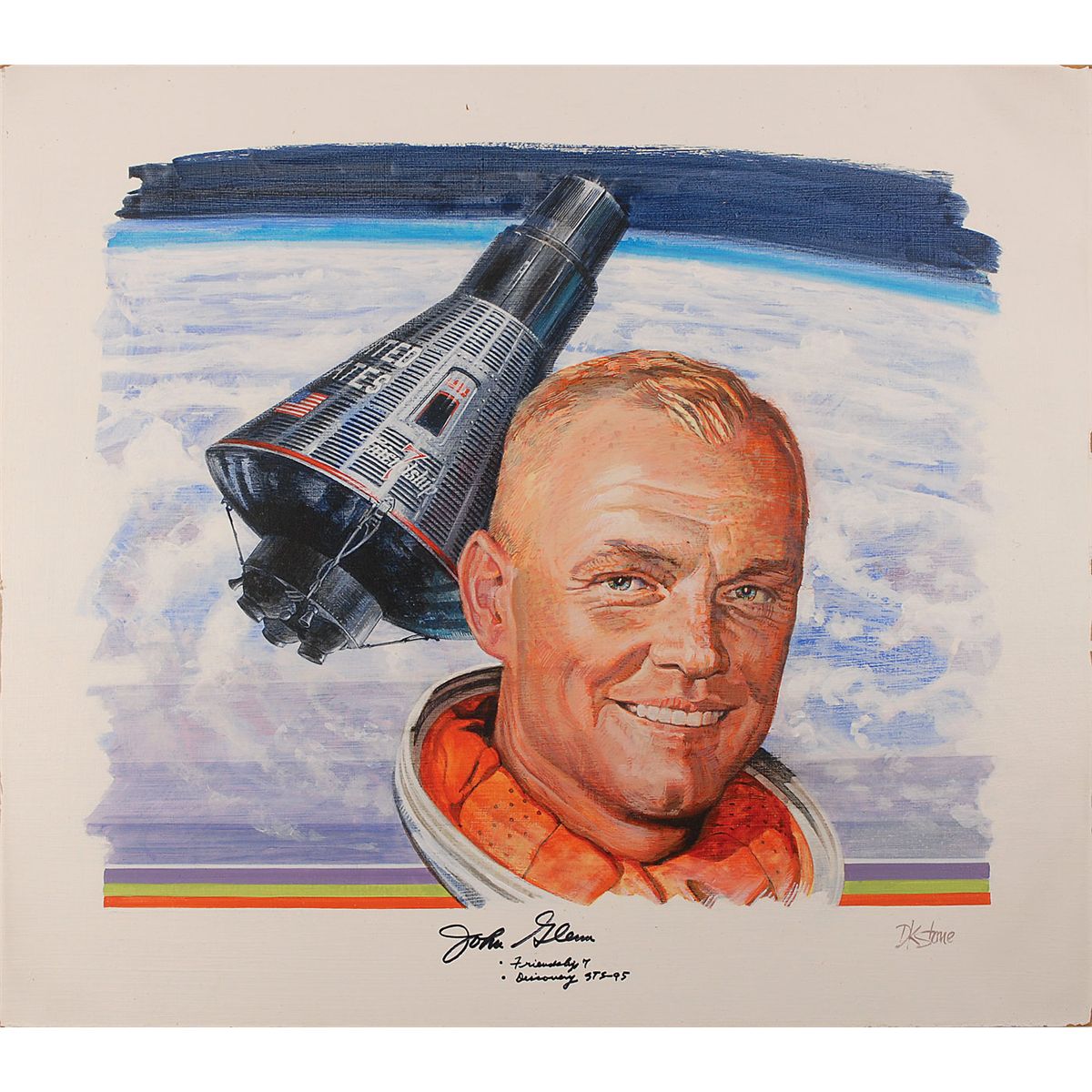 Original color oil painting by David K. Stone on a 26 x 23 masonite board, featuring a portrait of Glenn in front of the Friendship 7 capsule, signed in the lower border in black felt tip, “John Glenn, Friendship 7, Discovery STS-95.” Also signed by the artist in paint in the lower right. In fine condition, with some chipping to the edges.