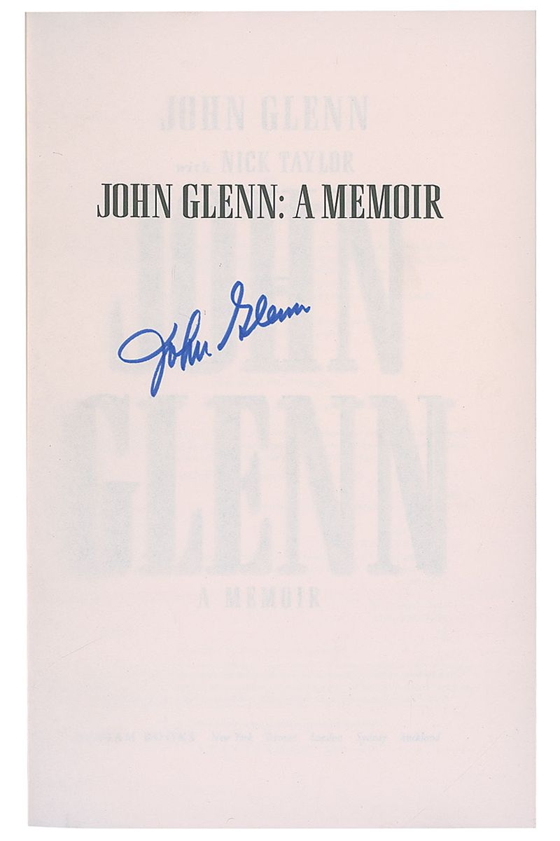 Signed book: John Glenn: A Memoir. First edition, first printing. NY: Bantam Books, 1999. Hardcover with dust jacket, 6.5 x 9.5, 422 pages. Signed on the half-title page in blue felt tip. In very fine condition.