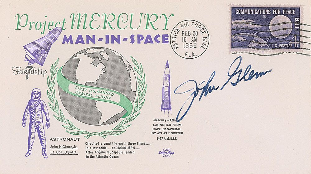 Commemorative cover with an attractive cachet honoring Project Mercury, signed in blue ink by Glenn. In very fine condition.