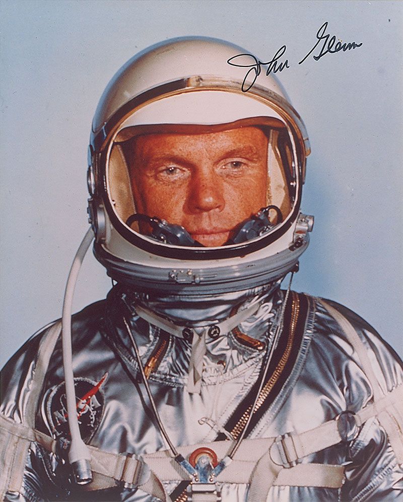 Color satin-finish 8 x 10 photo of Glenn in his Mercury flight suit, signed in black felt tip. In very fine condition.