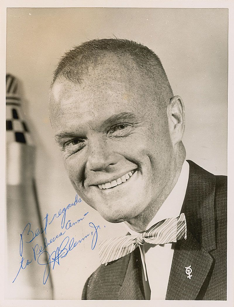 Vintage glossy 7 x 9 United Press International photo of Glenn in a shirt and bow tie, a Mercury pin on his lapel, signed and inscribed in blue ballpoint, “Best regards to Rebecca Ann—J. H. Glenn, Jr.” In fine condition.