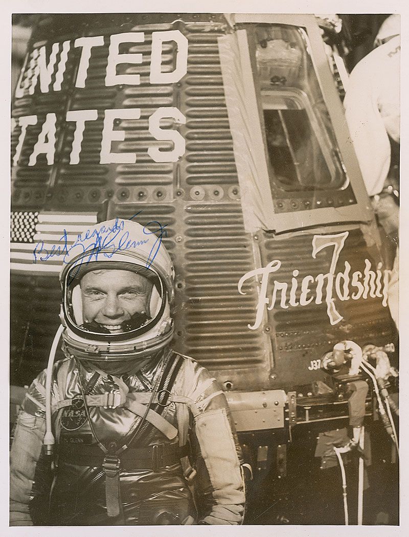 Vintage glossy 7 x 9 United Press International photo of Glenn dressed in his Mercury space suit in front of his capsule, signed in blue ballpoint, “Best regards, J. H. Glenn, Jr.” In fine condition.