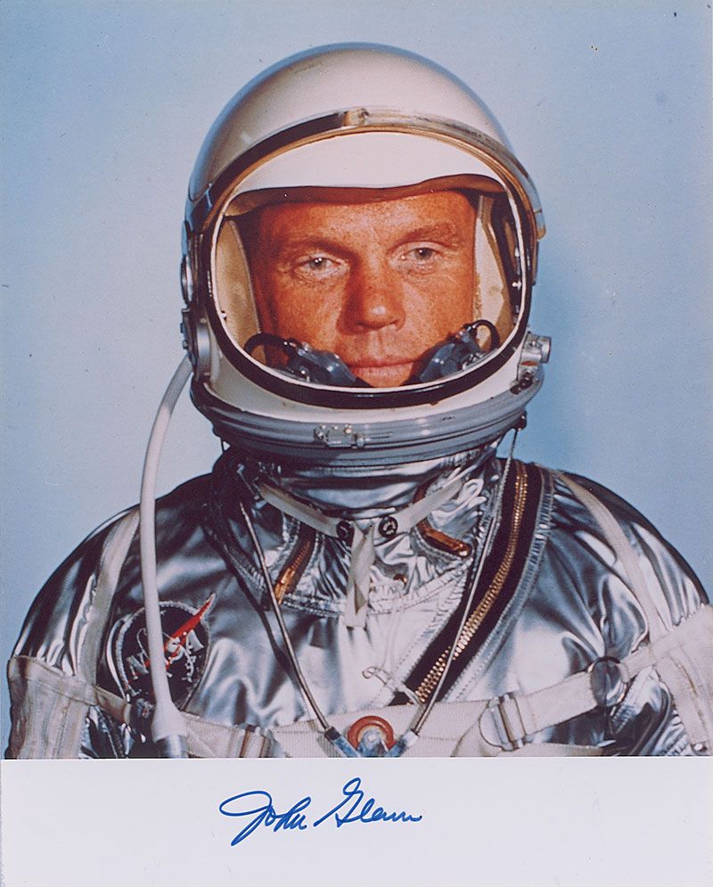 Color satin-finish 8 x 10 photo of Glenn in his Mercury space suit, signed in the lower border in blue felt tip. In very fine condition.
