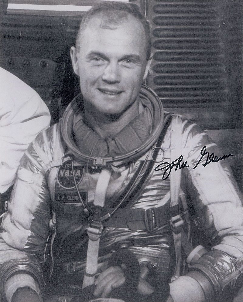 Satin-finish 8 x 10 photo of Glenn in his space suit, signed in black felt tip. In fine condition.