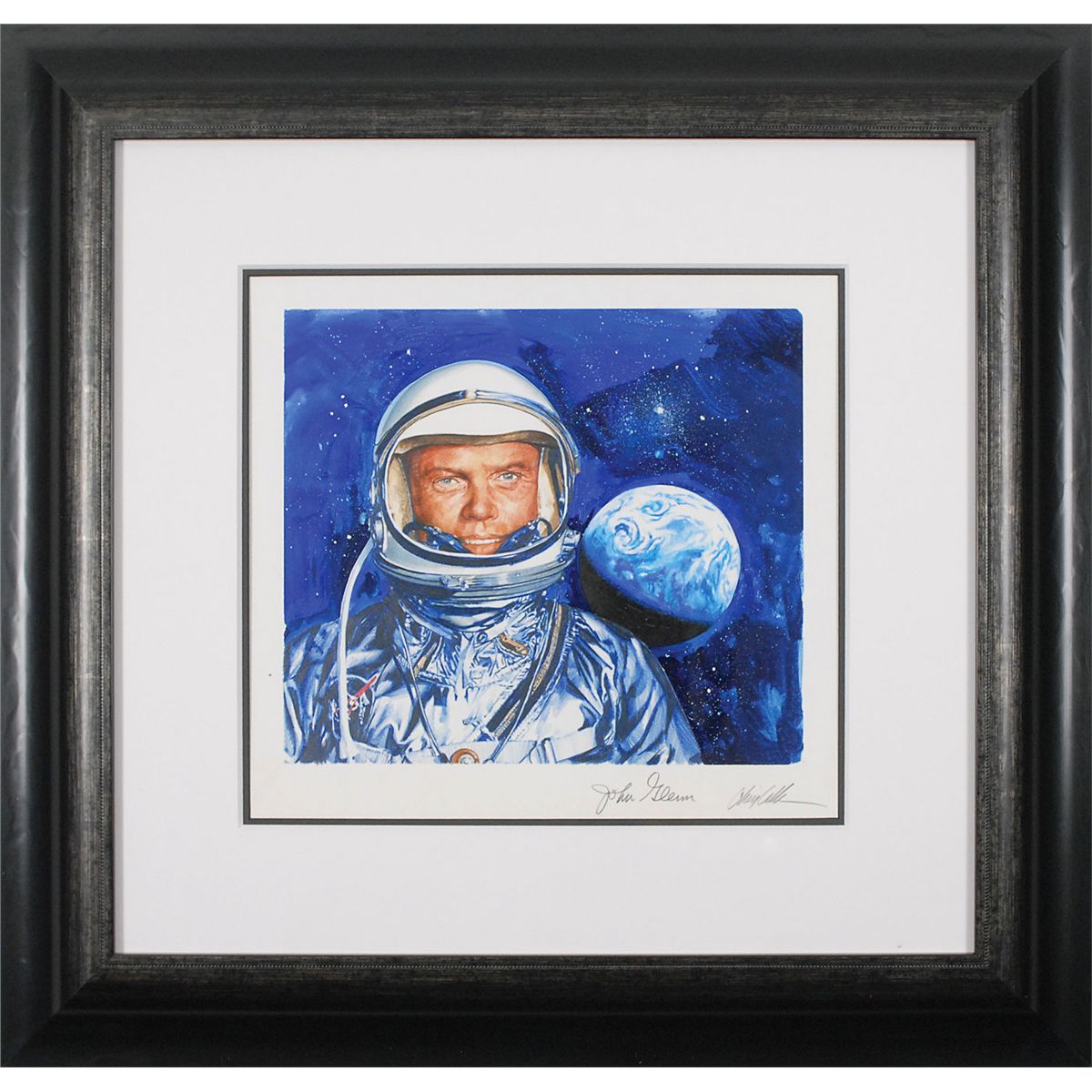 Original artwork by Chris Calle entitled, ‘John Glenn—1962’ mixed media on hot press illustration board, 12.5 x 11.75, depicting Glenn in his Mercury space suit, signed in the lower border in pencil by Glenn and also signed by the artist Chris Calle. Double-matted and framed to an overall size of 24 x 23. In fine condition, with a small area of surface loss to lower left.