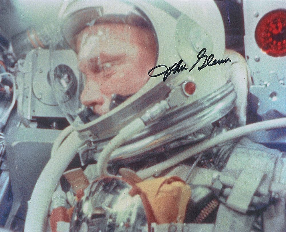 Color satin-finish 10 x 8 photo of Glenn in flight, signed in black felt tip. In fine condition.