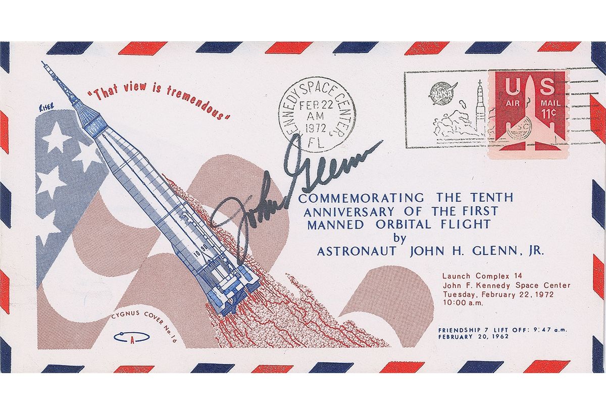 Commemorative cover with a cachet honoring the 10th anniversary of the first manned orbital flight, signed in black felt tip. In fine condition.