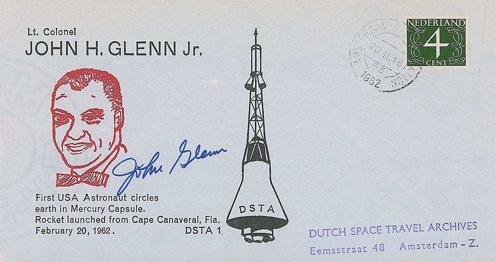 Commemorative cover with a cachet honoring John Glenn’s Mercury mission, signed in blue felt tip. Cover also bears a Dutch Space Travel Archives stamp also. In fine condition.