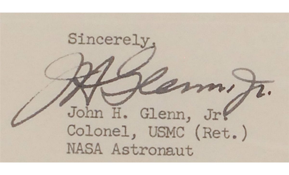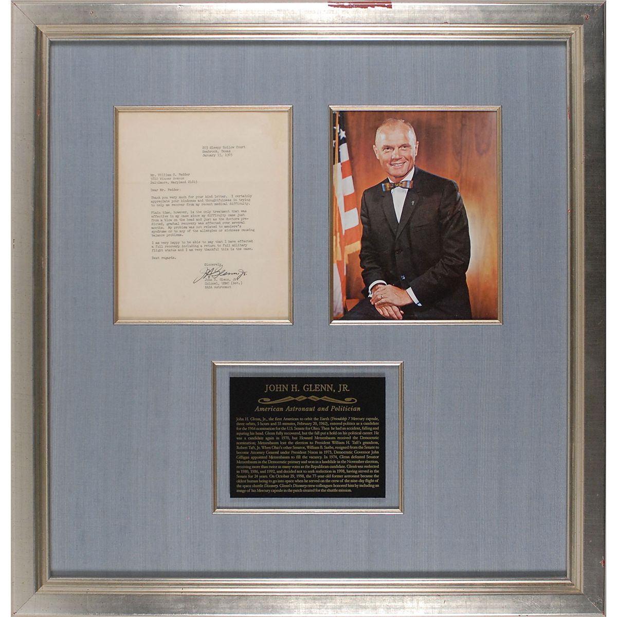 TLS signed “J. H. Glenn, Jr,” one page, 7.5 x 9.5, January 15, 1965. Letter to an admirer concerning his health and fitness after suffering a head injury. In part, “I certainly appreciate your kindness and thoughtfulness in trying to help me recover from my recent medical difficulty. Plain time, however, is the only treatment that was effective in my case since my difficulty came just from a blow on the head and just as the doctors predicted, gradual recovery was effected over several months. My problem was not related to Meniere’s syndrome or to any of the allergies or sickness causing balance problems.” Nicely cloth-matted and framed by Gallery of History with a color portrait of Glenn and a biographical plaque to an overall size of 26.5 x 27.5. Creasing and dampstaining along right side, otherwise fine condition. One week later, Glenn would retire from the service and embark on a business career.