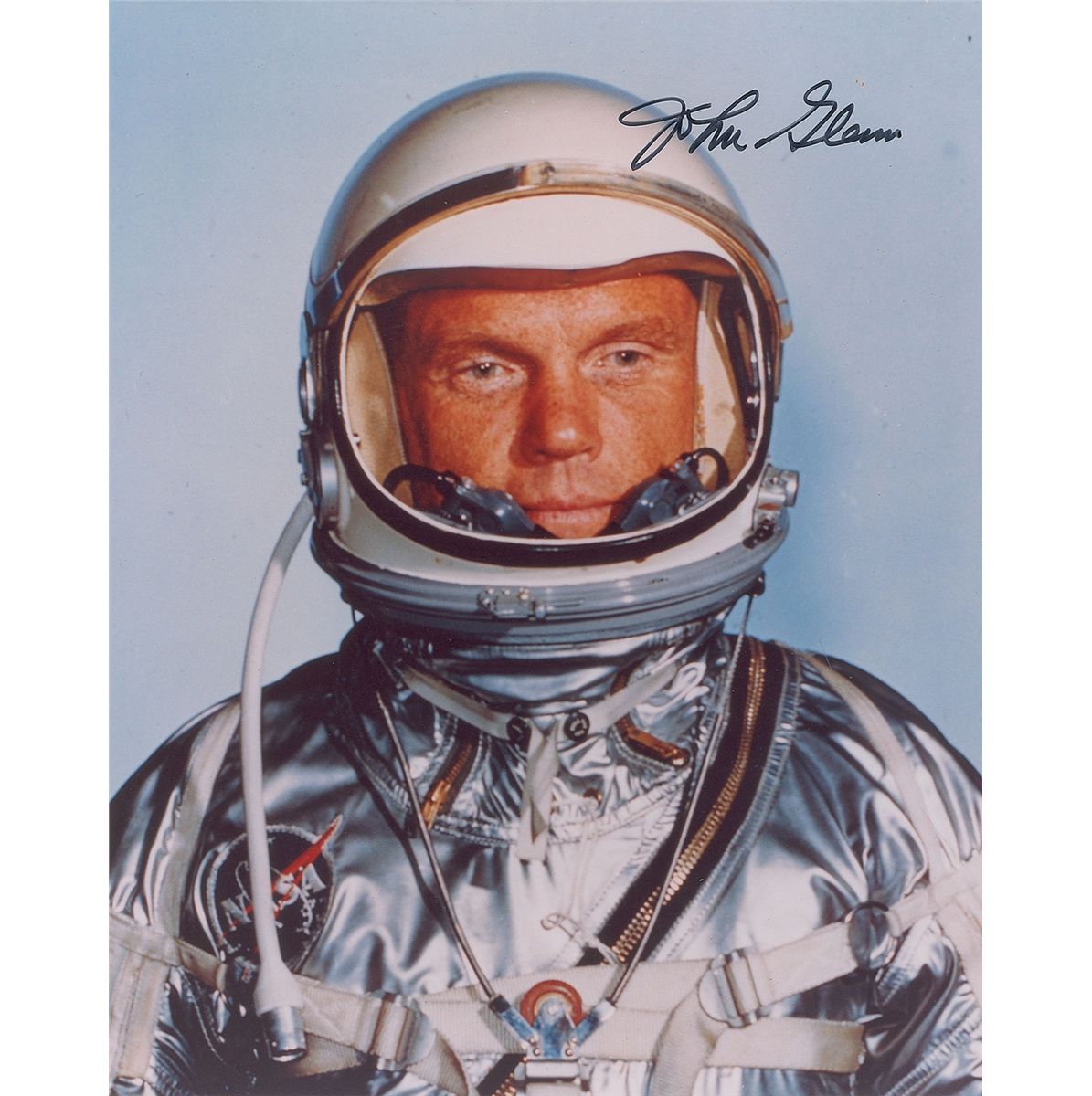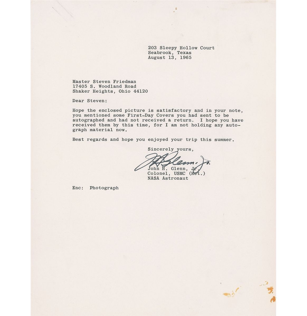 Two items: TLS, signed “J. H. Glenn, Jr.,” one page, 8.5 x 11, August 13, 1965. Letter to a collector reads, in part: “Hope the enclosed picture is satisfactory…you mentioned some First-Day Covers you had sent to be autographed…I hope you have received them by this time”; and a color satin-finish 8 x 10 photo of Glenn in his Mercury space suit, signed in black felt tip. A bit of light soiling and creasing to letter, otherwise fine condition.