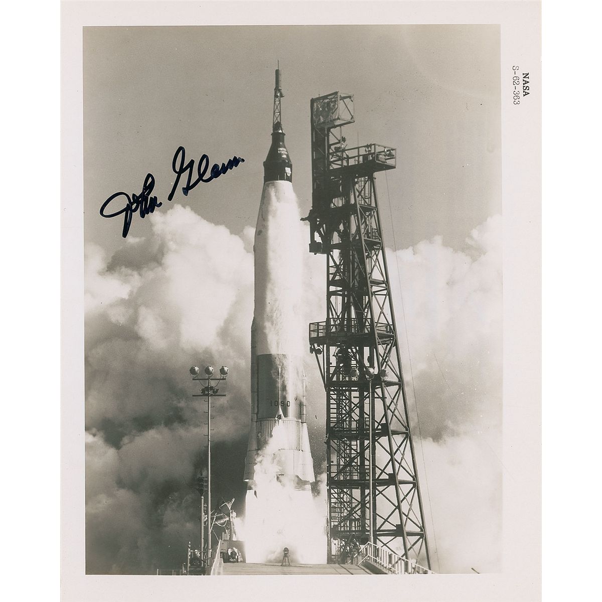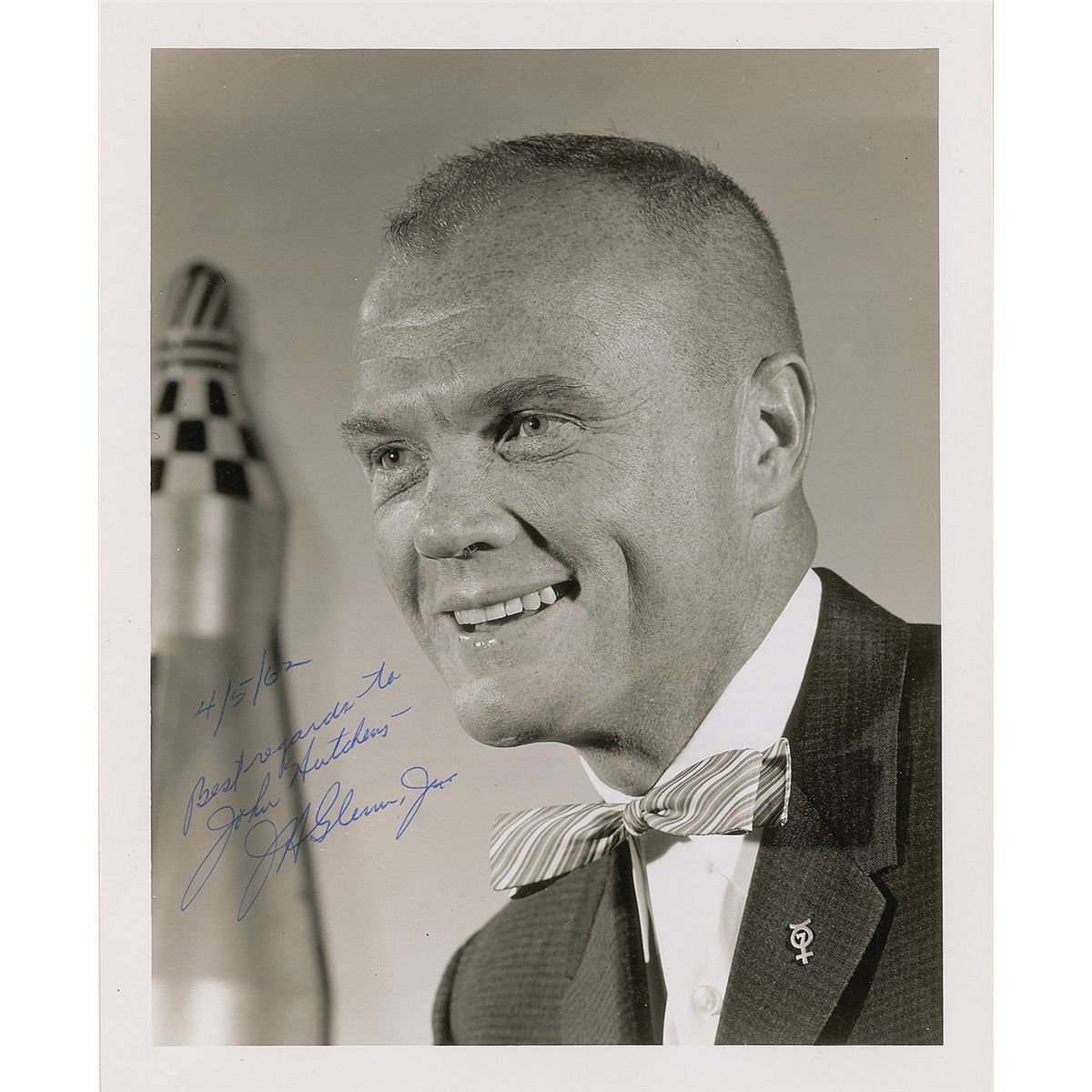 Two vintage glossy 8 x 10 NASA photos: one of Glenn in a jacket and bow tie, signed and inscribed in blue ballpoint, “4/5/62, Best regards to John Hutchens—J. H. Glenn, Jr.”; and one of the launch of Glenn’s space craft lifting off, signed later in black felt tip. In fine condition.