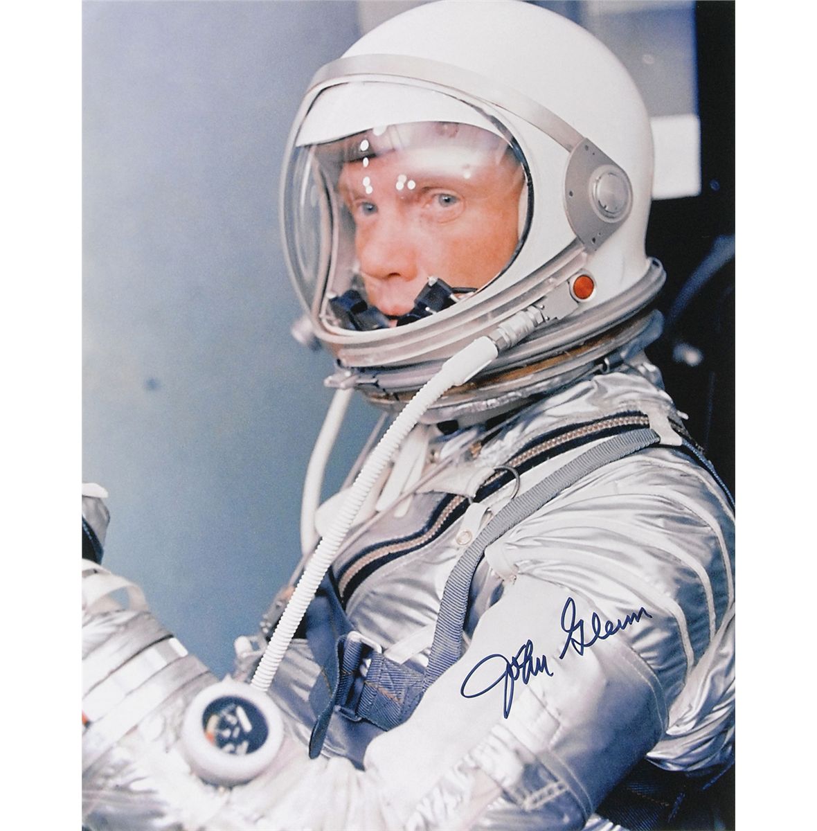Color satin-finish 10.75 x 14 photo of Glenn in his Mercury space suit, signed in black felt tip. In very fine condition.