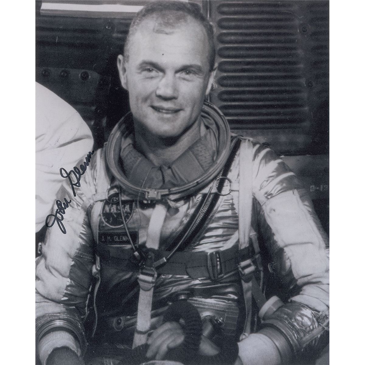 Satin-finish 8 x 10 half-length photo of Glenn in his Mercury space suit, signed in black felt tip. In fine condition, with a slightly grainy quality to the image.