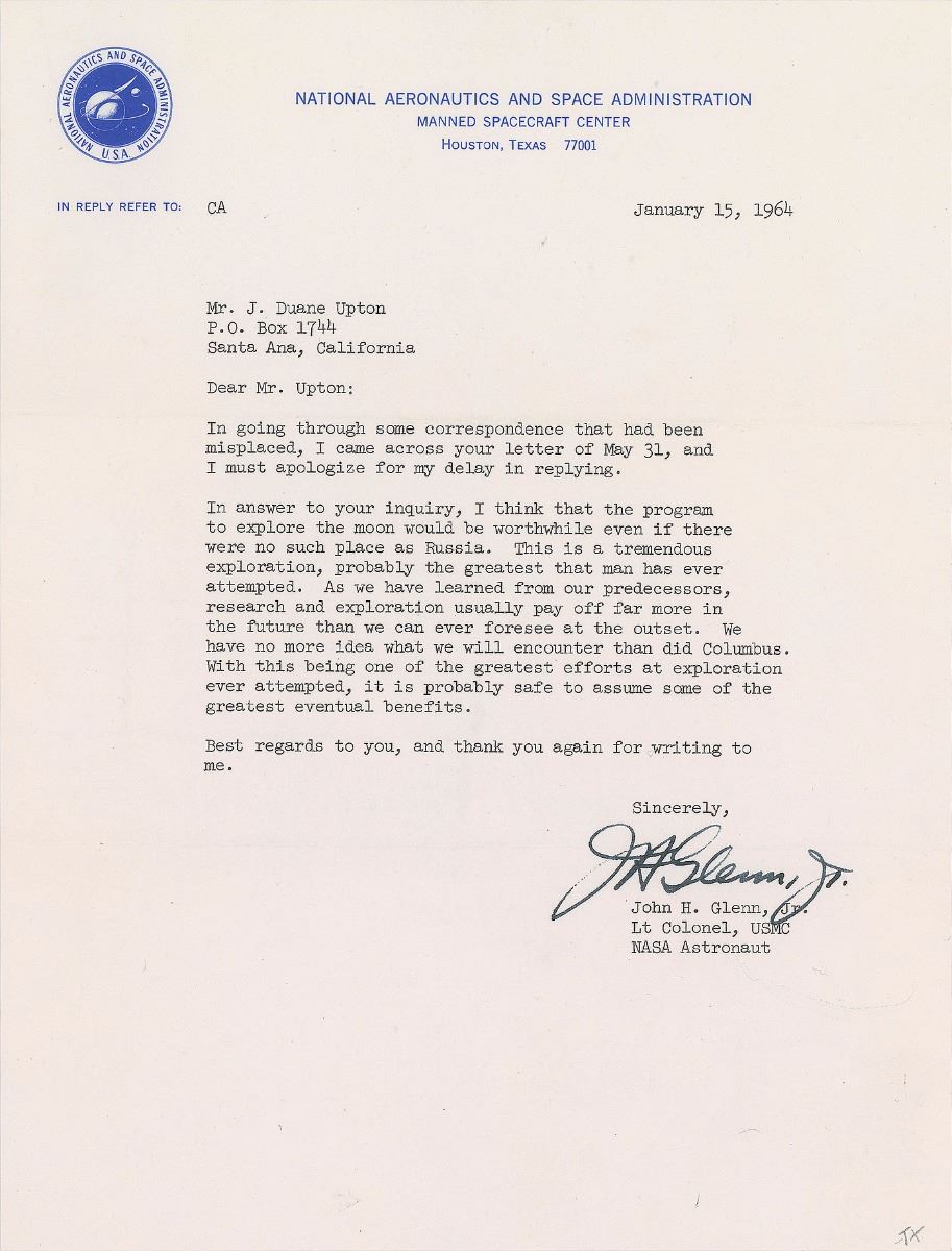 TLS signed “J. H. Glenn, Jr.,” one page, 8 x 10.5, NASA letterhead, January 15, 1964. Letter to J. Duane Upton, in part: “In answer to your inquiry, I think that the program to explore the moon would be worthwhile even if there were no such place as Russia. This is a tremendous exploration, probably the greatest that man has ever attempted. As we have learned from our predecessors, research and exploration usually pay off far more in the future than we can ever foresee at the outset. We have no more idea what we will encounter than did Columbus. With this being one of the greatest efforts at exploration ever attempted, it is probably safe to assume some of the greatest eventual benefits.” In fine condition. A tremendous pre-Gemini letter from the first man to orbit the Earth, commenting on both the Cold War’s ‘space race’ and the future of exploration . Interestingly, Glenn resigned from NASA the day after writing this letter, and, a day after that, announced his candidacy as a Democrat for the US Senate from his home state of Ohio; of course, he would fly again on the STS-95 Space Shuttle mission in 1998.