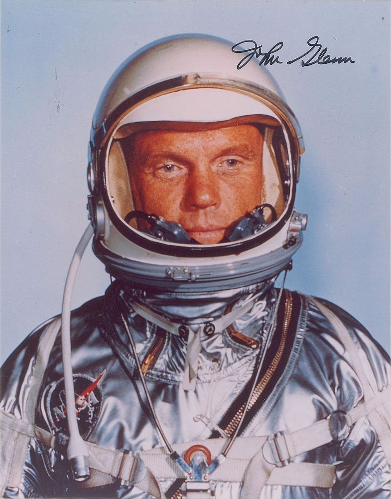 Color semi-glossy 8 x 10 head-and-shoulders photo of Glenn wearing his Mercury space suit, signed in black felt tip. In very fine condition.