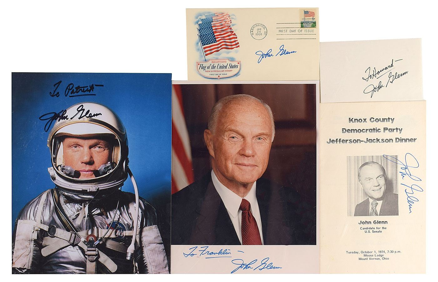 Five items signed in felt tip by John Glenn, consisting of a pamphlet, two color photos, an FDC, and an off-white card, ranging in size from 5 x 3 to 8 x 10, with Glenn adding inscriptions to three of the items. In overall fine condition. Accompanied by a certificate of authenticity from PSA/DNA for one of the photos.