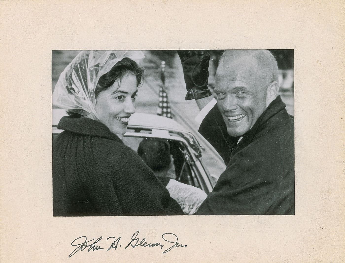 Glossy 6.5 x 4.5 photo of John Glenn and his wife, Annie, riding in a convertible during the parade celebrating Glenn's successful Friendship 7 flight, matted to an overall size of 9.25 x 7.25, signed on the mat in black ink, "John H. Glenn, Jr." Typed caption affixed to reverse notes that the signature was obtained at Gregory's Penthouse Restaurant in Phoenix on February 26, 1983. In fine condition, with a few surface scratches to the photo.