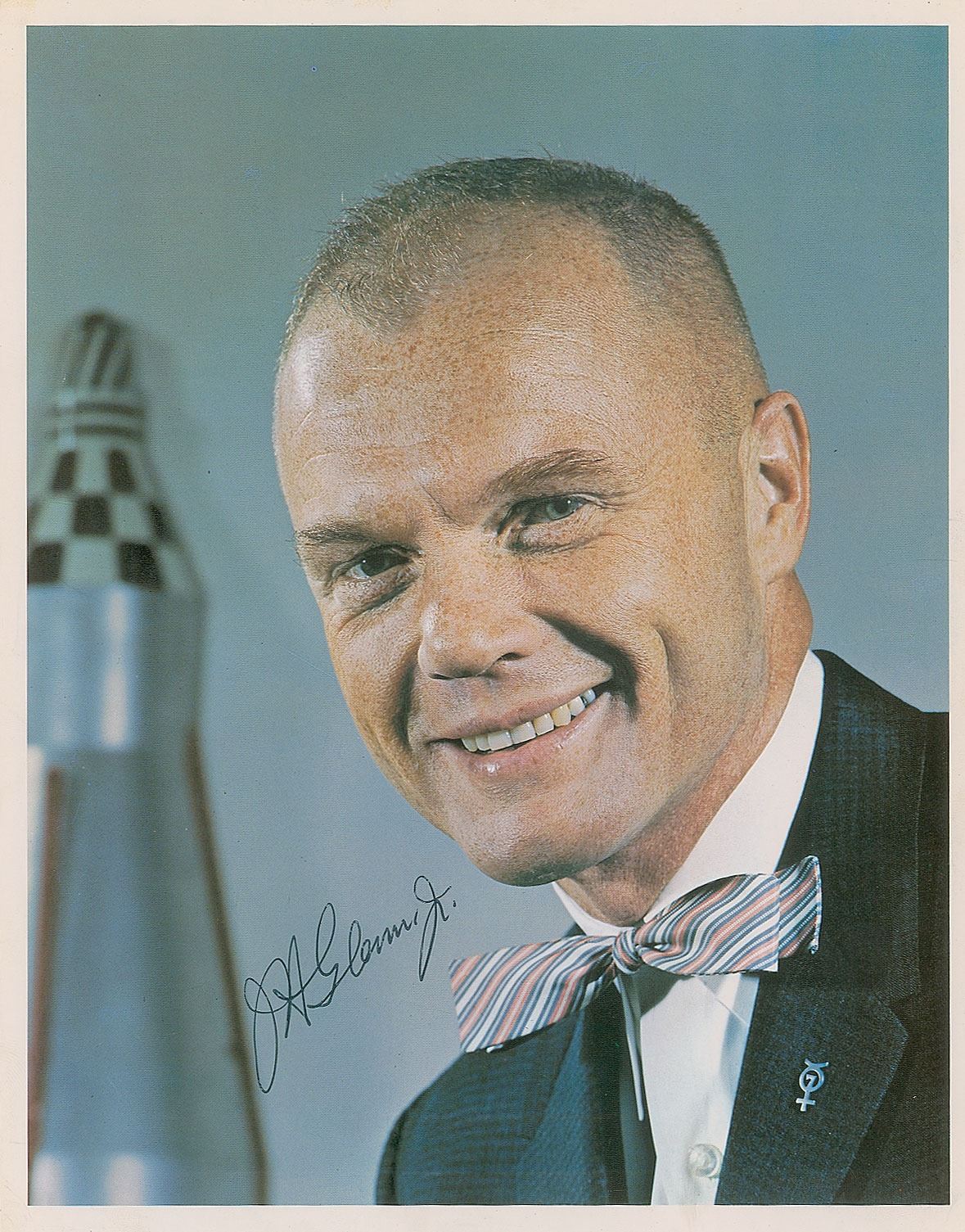 Color glossy 8 x 10.25 cardstock photo of Glenn wearing a suit and bow tie, with his lapel bearing a Mercury 7 logo pin, signed in black ballpoint, "J. H. Glenn, Jr." In fine condition, with some light creases to the background. Accompanied by a transmittal letter from NASA dated November 1962.