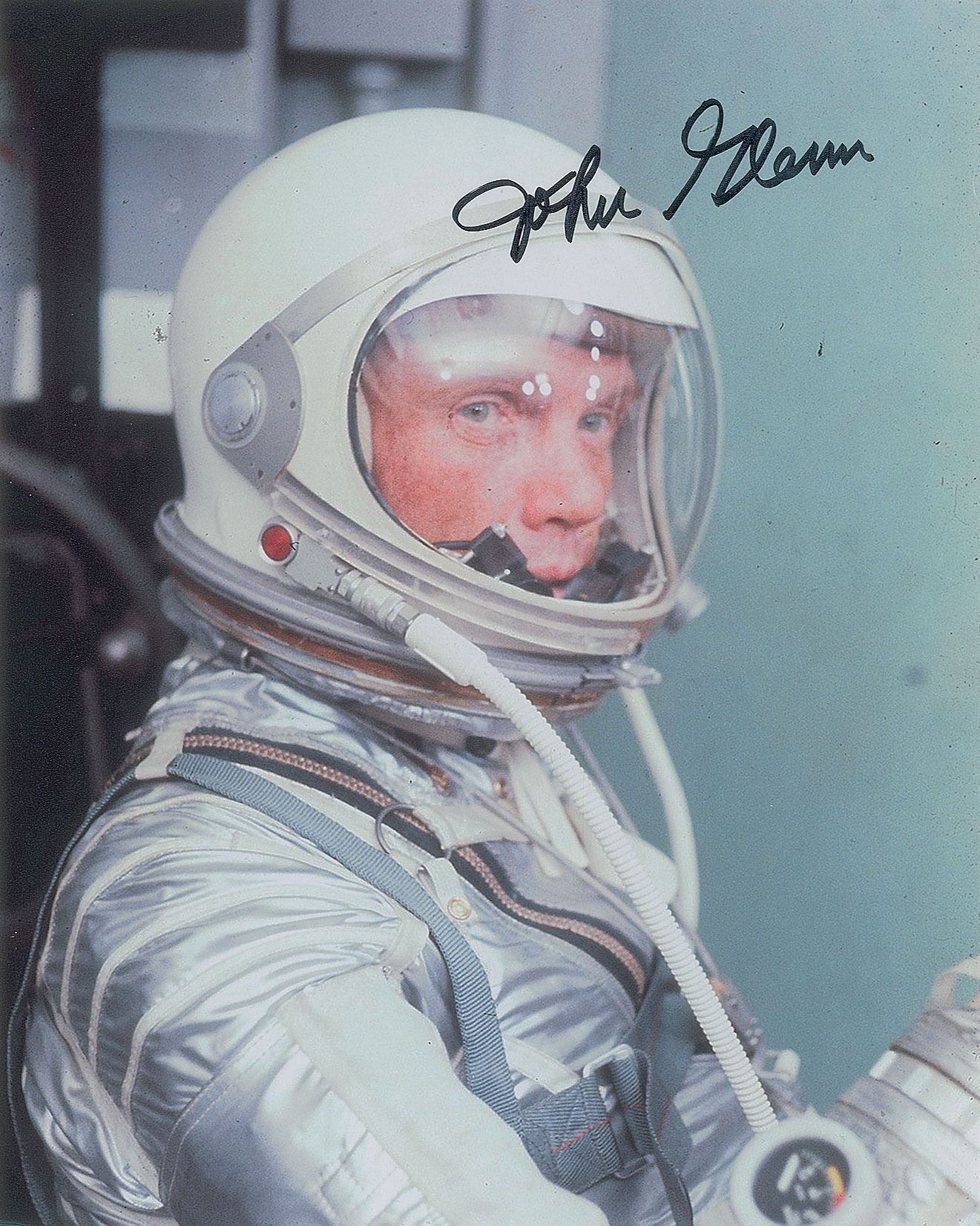 Color satin-finish 8 x 10 photo of John Glenn in his silver Project Mercury flight suit, signed in black felt tip. In fine condition, with a couple of small surface creases.