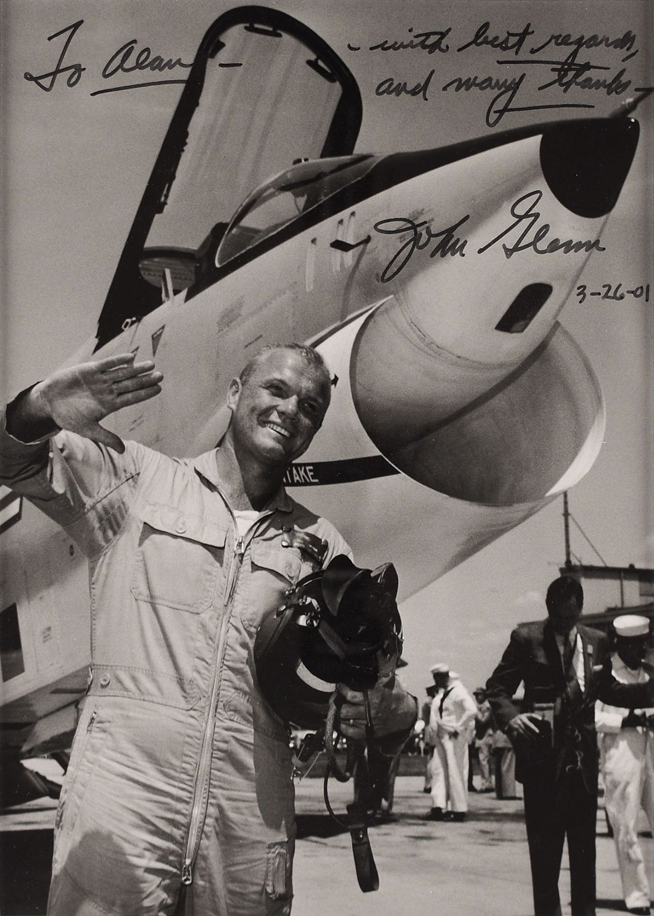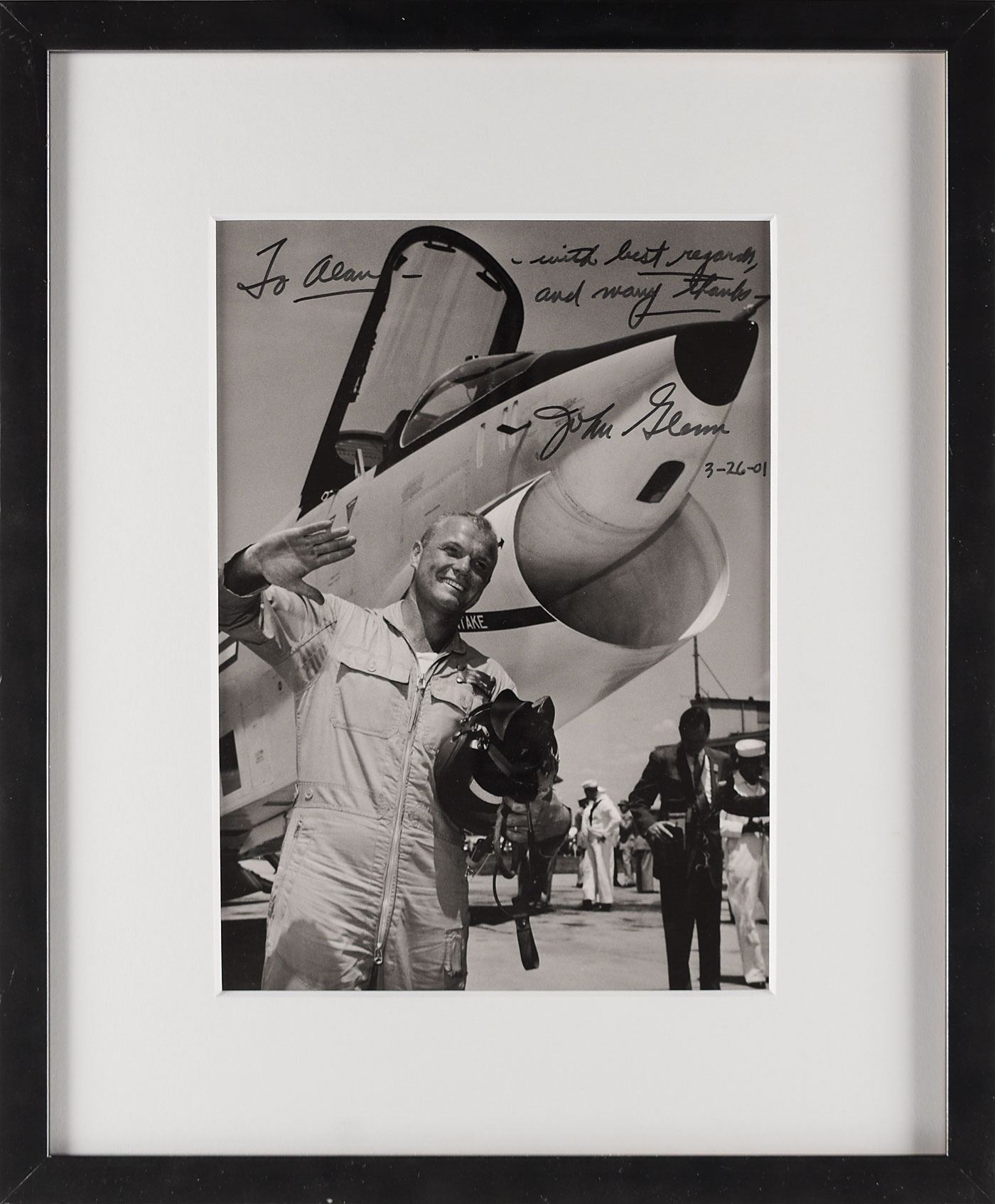 Fantastic semi-glossy 8.5 x 12 silver gelatin photo of Marine Corps Major John Glenn smiling next to his Vought F-8 Crusader after his record-breaking transcontinental flight, signed and inscribed in black felt tip, "To Alan—with best regards, and many thanks—John Glenn, 3–26–01.” Attractively matted and framed to an overall size of 15.5 x 18.75. In fine condition. On the morning of July 16, 1957, Glenn strapped into an F8U-1P jet aircraft and took off from Los Alamitos Naval Air Station in California. Three hours, 23 minutes, and 8.4 seconds later, he touched down at Floyd Bennett Field in Brooklyn, New York, setting a transcontinental speed record of 725.55 mph. The feat put Glenn on the radar just before selections would be made for the first class of astronauts.