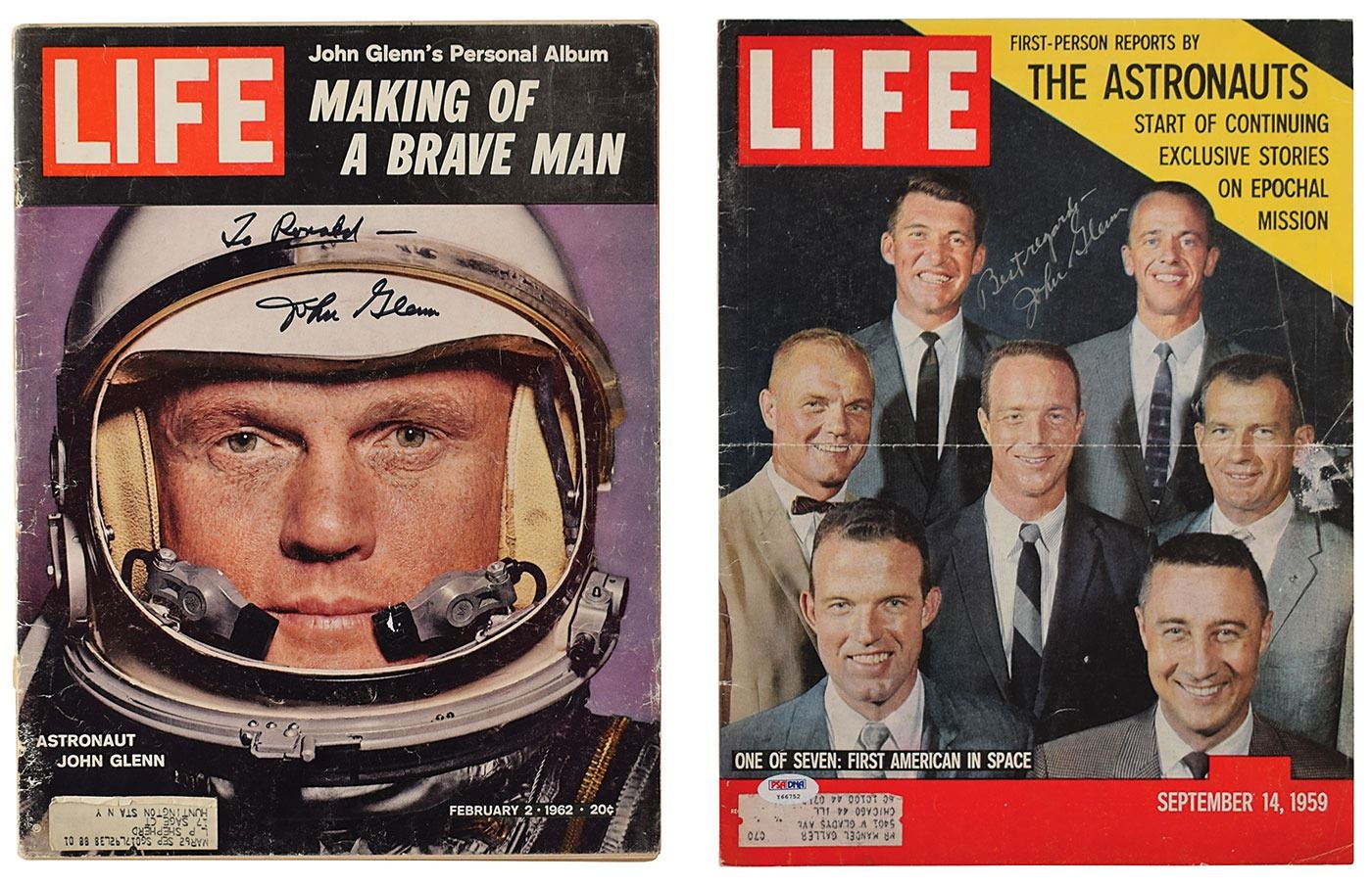 Two items: the front cover of a Life magazine from September 14, 1959, with image of the original Mercury 7 astronauts, signed in silver ink, "Best regards—John Glenn"; and a copy of Life magazine from February 2, 1962, with front cover image of Glenn in his Mercury space suit, signed and inscribed in black felt tip, "To Ronald—John Glenn." In overall very good to fine condition, with a central horizontal fold across the group-shot cover, which also features a PSA/DNA label affixed to lower left corner. Accompanied by a certificate of authenticity from PSA/DNA.