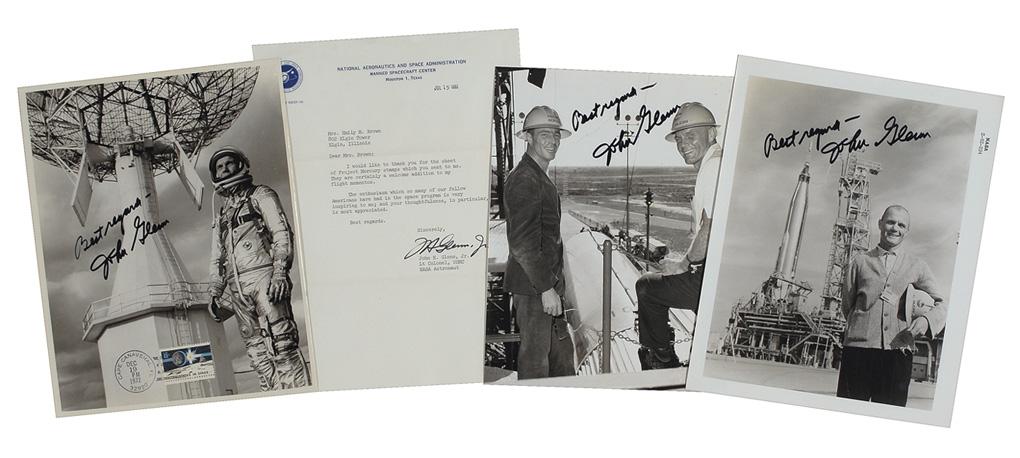 Four items: three color glossy 8 x 10 photos of Glenn working on Project Mercury, each signed in black felt tip, “Best regards—John Glenn”; and a TLS, signed “J. H. Glenn, Jr.,” one page, 8 x 10.5, NASA letterhead, stamp dated July 15, 1963. Glenn sends thanks for a gift of stamps. In part: “The enthusiasm which so many of our fellow Americans have had in the space program is very inspiring to me; and your thoughtfulness, in particular, is most appreciated.” In fine overall condition.