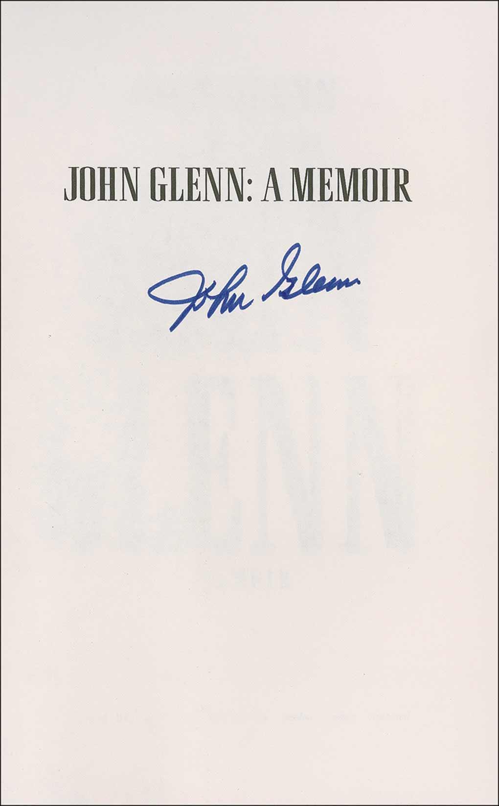 Signed book: John Glenn: A Memoir. First edition, first printing. NY: Bantam, 1999. Hardcover with dustjacket, 6.5 x 9.5, 422 pages. Signed on the half-title page in blue felt tip. In fine condition.