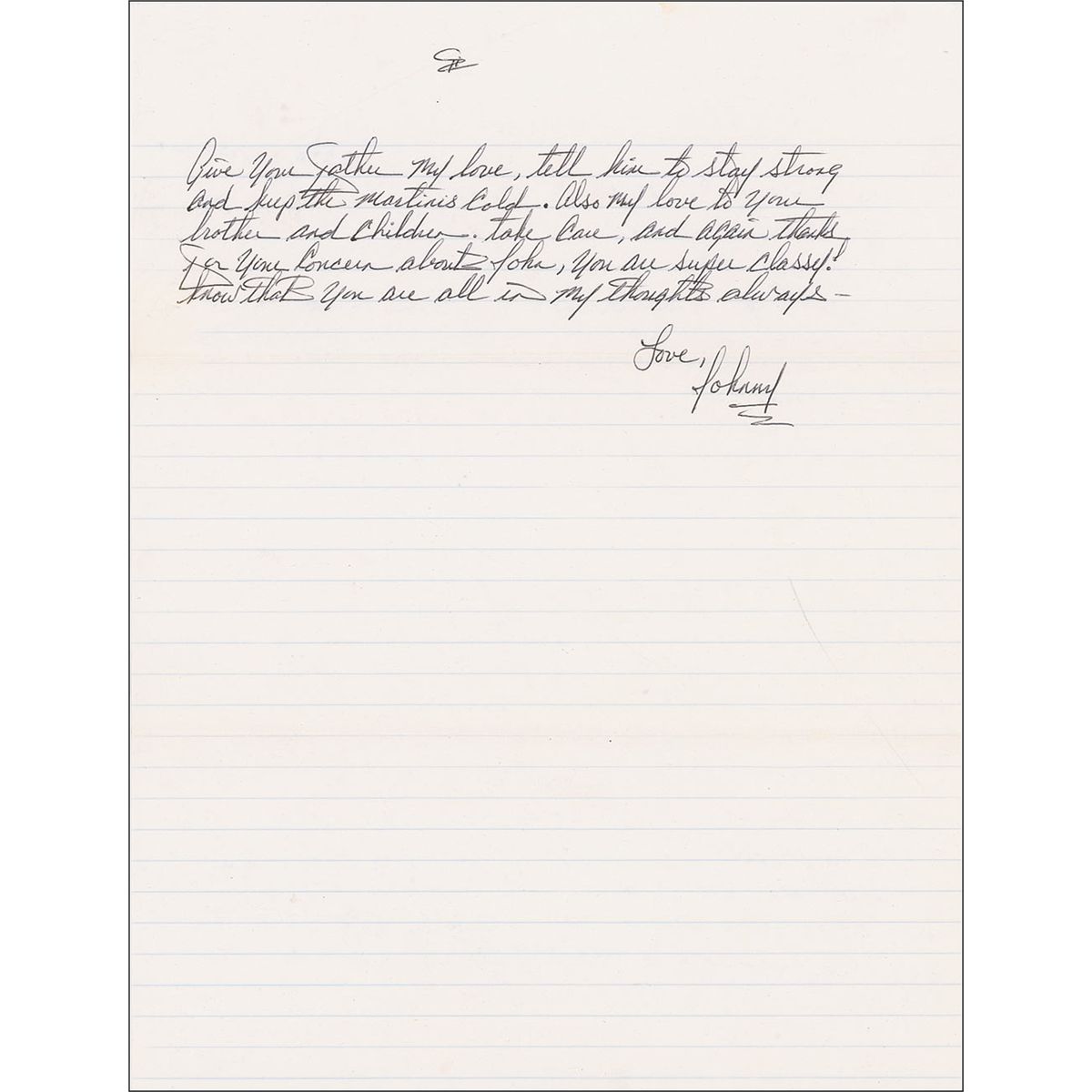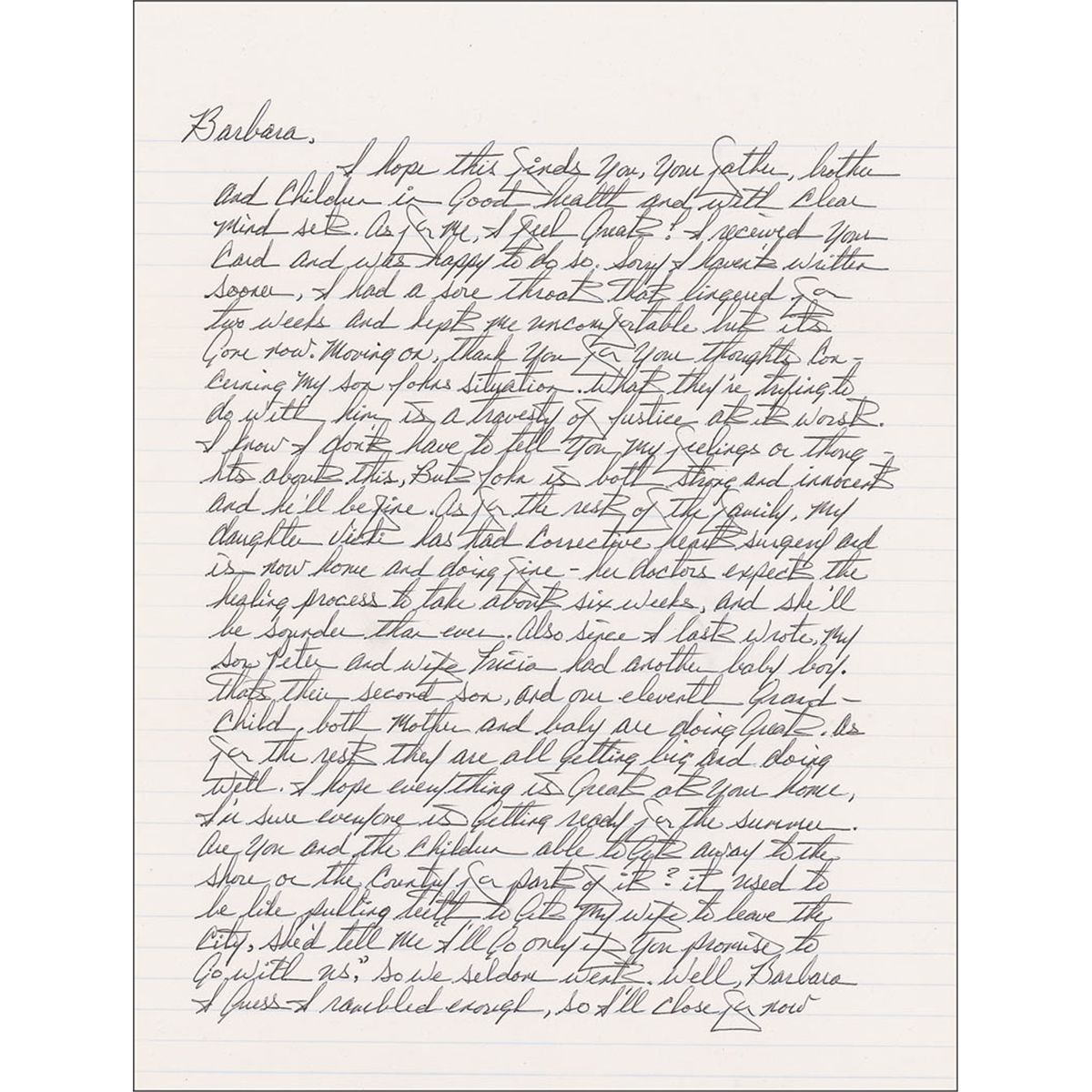 Organized crime boss (born 1940) who became a major media celebrity. After an extensive operation that cost $75 million, Gotti, who had repeatedly eluded the law, was convicted of murder and racketeering in 1992. As a repeat offender, he was sentenced to life in prison without possibility of parole and sent to federal prison in Marion, Illinois, where he died in 2002. ALS signed “Johnny,” two pages, lightly-lined, 8.5 x 11, no date. Letter to Barbara DeCicco, daughter of George DeCicco, New York mobster and longtime Capo in the Gambino crime family. In part: “Moving on, thank you for your thoughts concerning my son John’s situation. What they’re trying to do with him is a travesty of justice at its worst. I know I don’t have to tell you my feelings or thoughts about this, but John is both strong and innocent and he’ll be fine.” In fine condition. John Gotti, Jr.was indicted on racketeering in 1998, as he was believed to be acting boss of the family. Against his father's wishes, John Jr. pleaded guilty and was sentenced to six years and five months imprisonment in 1999.
