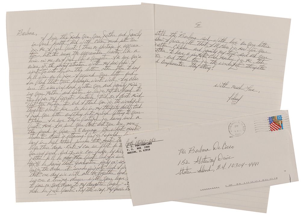 ALS signed “Johnny,” two pages, lightly-lined, 8.5 x 11, no date, but postmarked March 5, 1998. Letter to Barbara DeCicco, daughter of George DeCicco, New York mobster and longtime Capo in the Gambino crime family. In part: “There’s no shortage of aggravation, but it seems the aggravation reacts like a tonic on me as I feel like a youngster. I’m sure you’re aware of the phoney situation with my son John. I won’t go into it in this letter, other than to say he’ll win and be fine…I’m glad that your holidays went well. I’m also sure it was very hard with you and family missing your Mother and Sister so. As for my Son Frank, it is by far my biggest heartache–and, no, I don’t mind that you mention it, and I thank you for the wonderful thoughts about him, as he’s in my thoughts daily. And I find your letter anything but morbid…As for Reynold [Barbara’s son] being lazy in high school, sounds like most teenage boys these days–But I can see that he too has you very proud, and if we can judge by his grandfather he’ll be more than great.” In fine condition. Accompanied by the original mailing envelope, addressed in Gotti’s hand and signed “Gotti #18261-053” in the return address area. On March 18, 1980, Gotti's 12-year-old son, Frank, was run over and killed by John Favara, a neighbor. In July of that year, Favara was abducted and disappeared, presumed murdered.