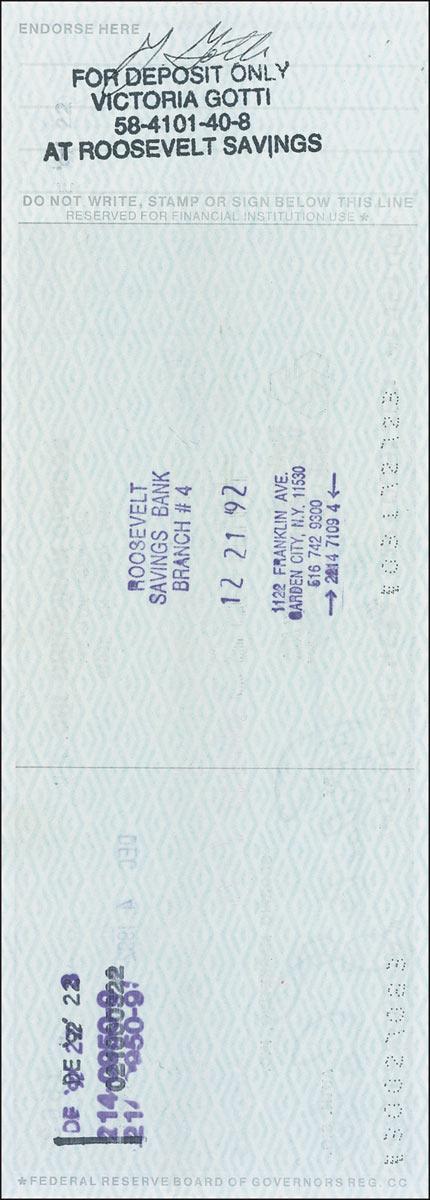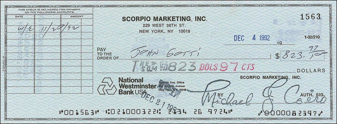 Business check, 8.25 x 3, drawn on the account of Scorpio Marketing, Inc., payable to John Gotti for $823.97, and endorsed by Gotti on the back, as “J. Gotti,” stamp-dated December 4, 1992. In fine condition, with expected cancellation stamps. Accompanied by a letter of authenticity from James Spence. Pre-certified PSA/DNA and RRAuction COA.