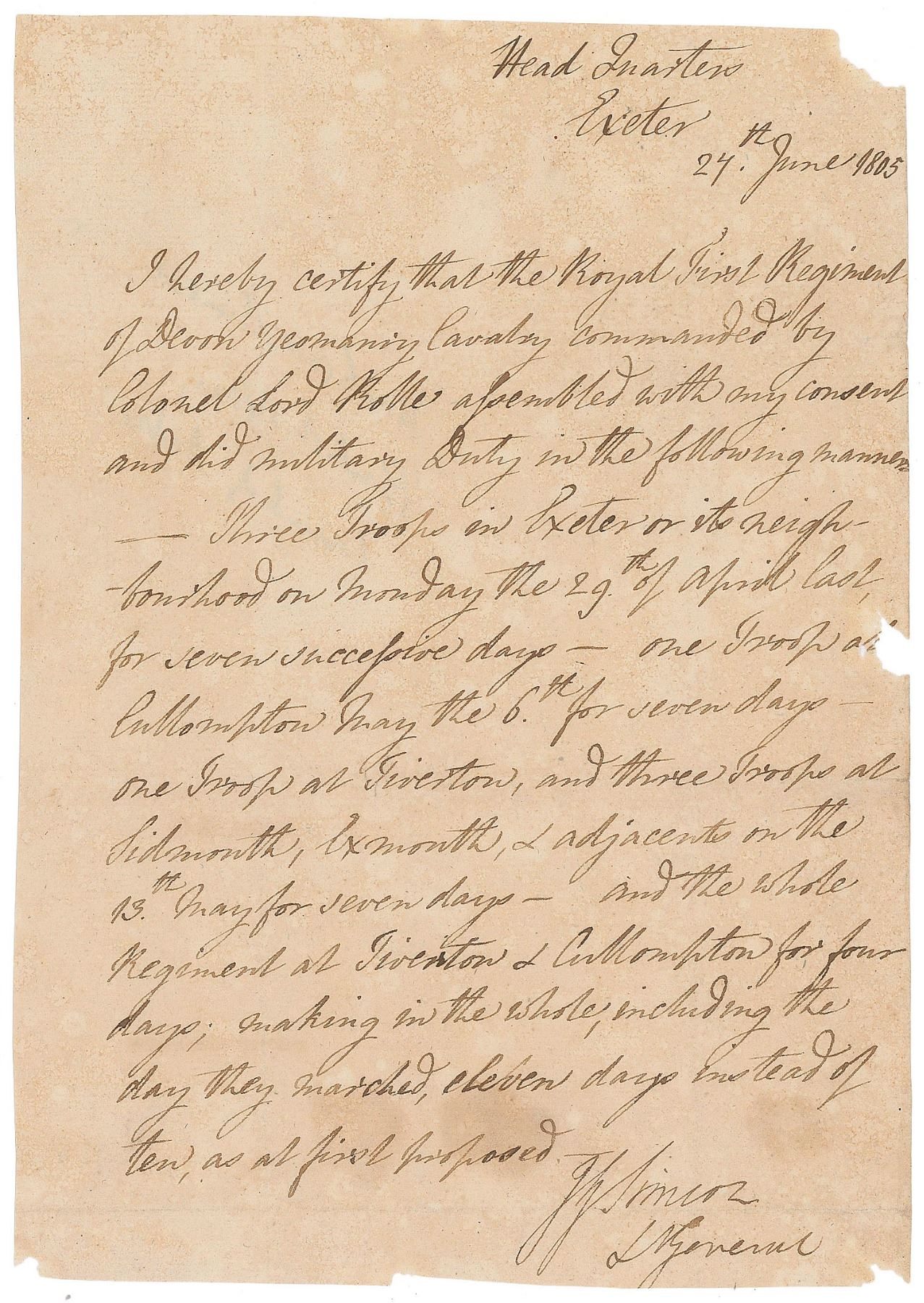 British Army general (1752–1806) who served as the first Lieutenant Governor of Upper Canada from 1791 until 1796; during the Revolutionary War, he saw action during the Siege of Boston, at the Battle of Brandywine, and in New Jersey. ALS signed “J. G. Simcoe, Lt. General,” one page, 6.75 x 9.5, June 27, 1805. Letter issued from his headquarters at Exeter, in part: "I hereby certify that the Royal First Regiment of Devon Yeomaning Cavalry commanded by Colonel Lord Rolle assembled with my consent and did military duty in the following manner:—Three Troops in Exeter or its neighbourhood on Monday the 29th of April last, for seven consecutive days—one Troop at Cullompton May the 6th for seven days…and the whole Regiment at Tiverton & Cullompton for four days; making in the whole, including the day they marched, eleven days instead of ten, as first proposed." In very good to fine condition, with trimmed edges, and small areas of paper loss affecting one word of text.