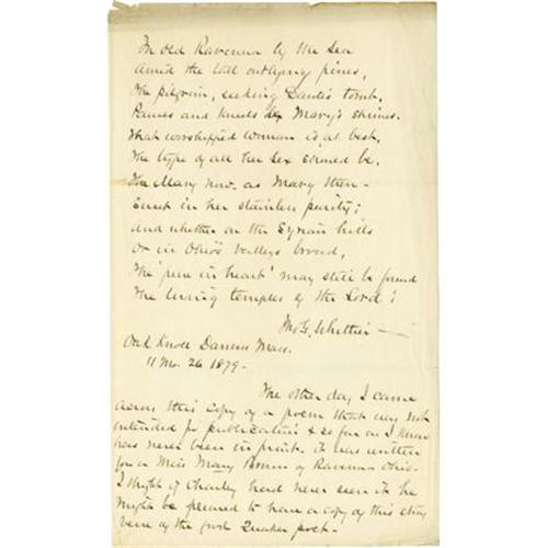 <B>John Greenleaf Whittier Autograph Note Signed,</B></I> “<I>Jno. G. Whittier</B></I>”, one page, 4.75” x 8”, Oak Knoll, Danvers, Massachusetts, November 26, 1879. Twelve lines of signed verse are accompanied by the following note: “<I>The other day I came across a copy of a poem that was not intended for publication & so far as I know has never been in print. It was written for a Miss Mary Bowen of Ravenna Ohio. I thought if Charley had never seen it he might be pleased to have a copy of this stray verse of the good Quaker pref.</B></I>” The first four lines of the poem are: “<I>In old Ravenna by the sea / Amid the tall outlying pines / The pilgrim, seeking Dante's tomb / Pauses and kneels by Mary's shrine…</B></I>”. Browning along top margin, fine condition overall. Whittier (1807-1892), a Quaker and an Abolitionist, was one of 19th century America's foremost men of letters. <BR><BR><b>Shipping:</b> Flat Material, Small (<a target="_blank" href="http://www.heritageauctions.com/common/shipping.php">view shipping information</a>)