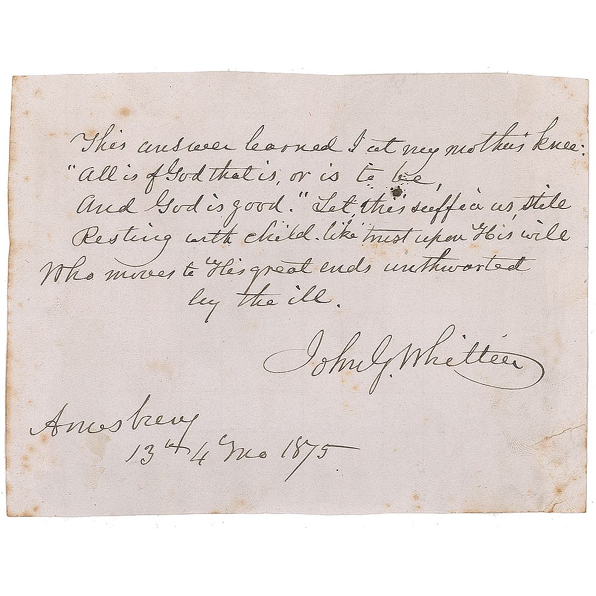 AQS, signed “John G. Whittier,” on a 4.75 x 3.5 sheet of graph-like paper, dated Amesbury, 13th 4mo, 1875. In full, “This answer learned I at my mother’s knee: ‘All is of God that is, or is to be, And God is good.’ Let this suffice us still, Resting with child like trust upon his will. Who moves to His great ends unthwarted by the ill.” In very good condition, with mild rippling and foxing, and toning and creasing to corners from mounting remnants on reverse.