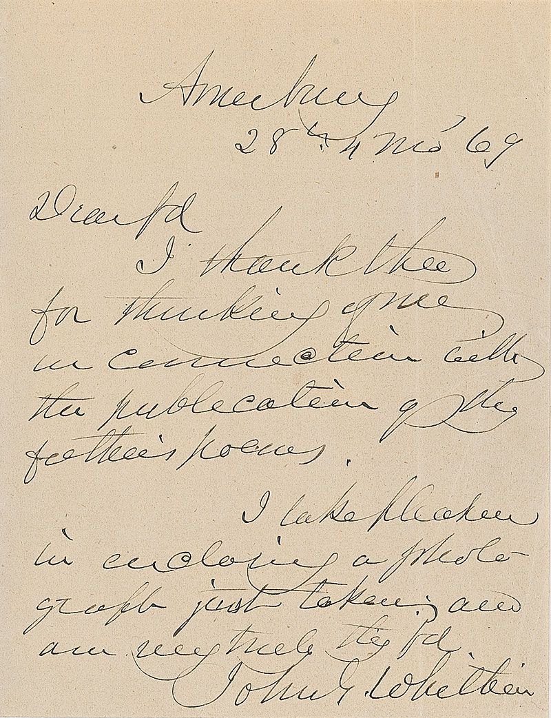 American Quaker poet and abolitionist (1807–1892) best known for such works as ‘Barbara Frietchie’ and ‘Maud Muller,’ which includes the immortal line, “For of all sad words of tongue or pen, The saddest are these: ‘It might have been!’ “ ALS signed “John J. Whittier,” one page, 3.75 x 4.75, April 28, 1869. Brief letter reads, in part: “I thank thee for thinking of me in connection with the publication of thy father’s poems. I take pleasure in enclosing a photograph just taken.” Accompanied by the original mailing envelope and an unsigned carte-de-visite photo of Whittier by Warren of Boston. In fine condition, with some scattered creases.