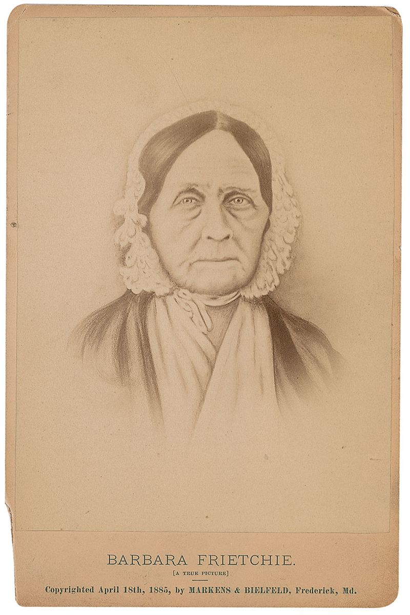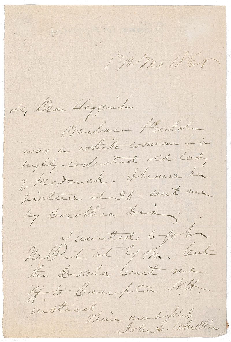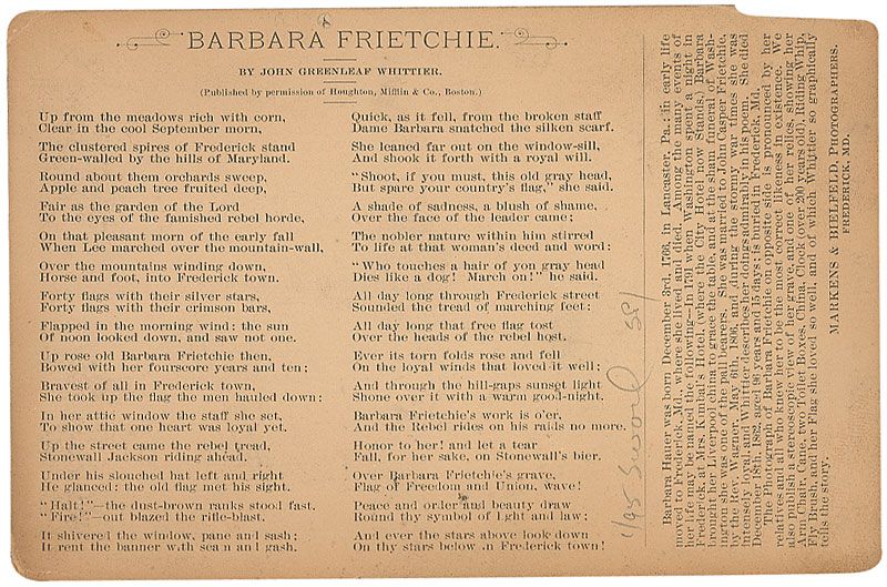 ALS signed “John G. Whittier,” one page, lightly-lined, 5 x 7.5, December 12, 1865. Letter to Thomas W. Higginson. In full: “Barbara Frietchie was a White Woman—a highly respected old lady of Frederick. I have her picture at 96—sent me by Dorothea Dix. I wanted to go to Mt. Pat at York, but the Doctor sent me off to Compton N. H. instead.” Intersecting folds, scattered creases, and a few mounting remnants to reverse, otherwise fine condition.