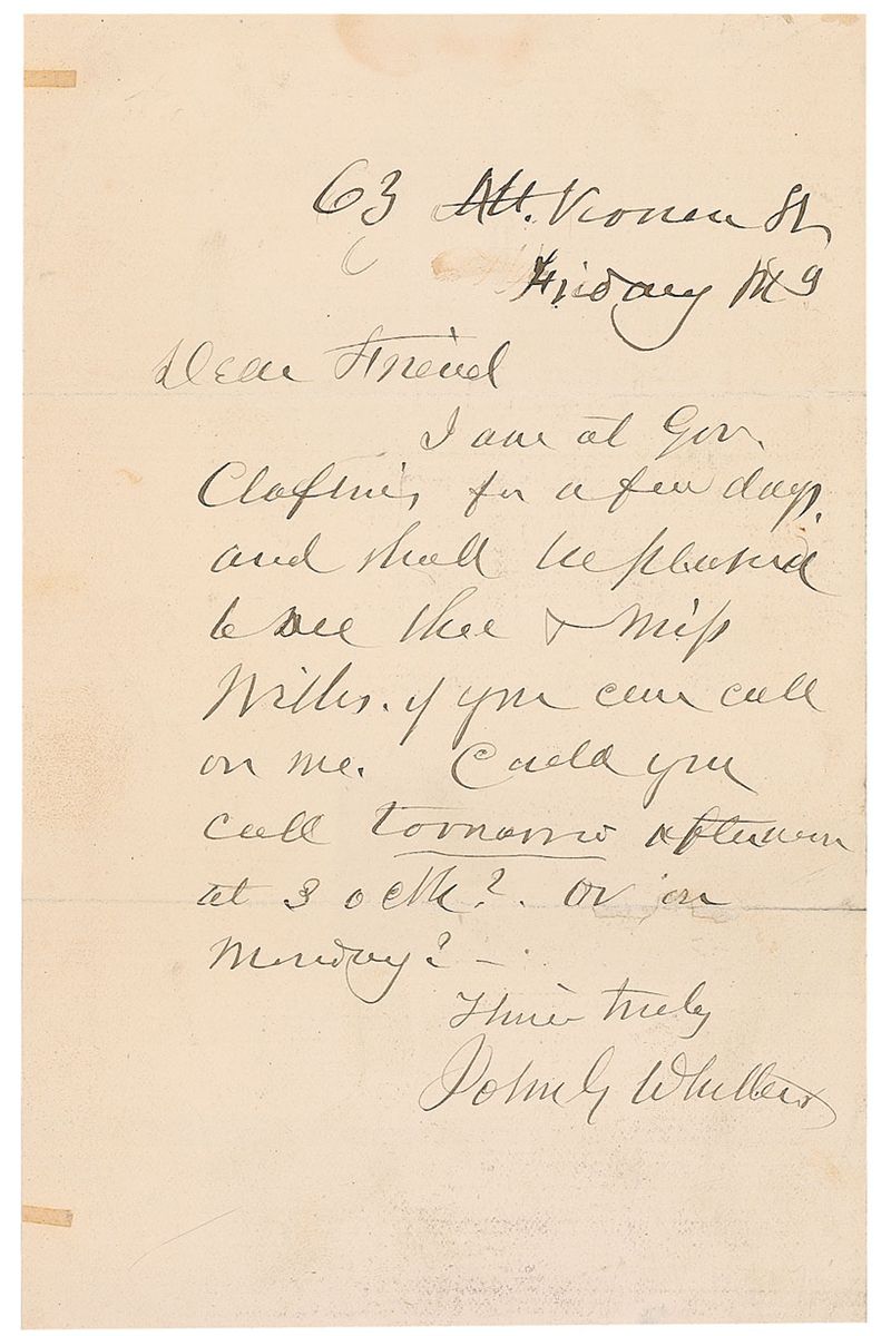 American Quaker poet and abolitionist (1807–1892) best known for such works as ‘Barbara Frietchie’ and ‘Maud Muller,’ which includes the immortal line, ‘For of all sad words of tongue or pen, The saddest are these: It might have been!’ ALS signed “John G. Whittier,” one page, 4.75 x 7.5, no date. Letter to a friend. In part: “I am at Gov. Claflin’s for a few days, and shall be pleased to see thee & Miss Willis if you can call on me.” In very good condition, with partial tape-repaired separation to one horizontal mailing fold, light scattered soiling, and two small toned tape remnants to left border. Accompanied by an engraved portrait of Whittier.